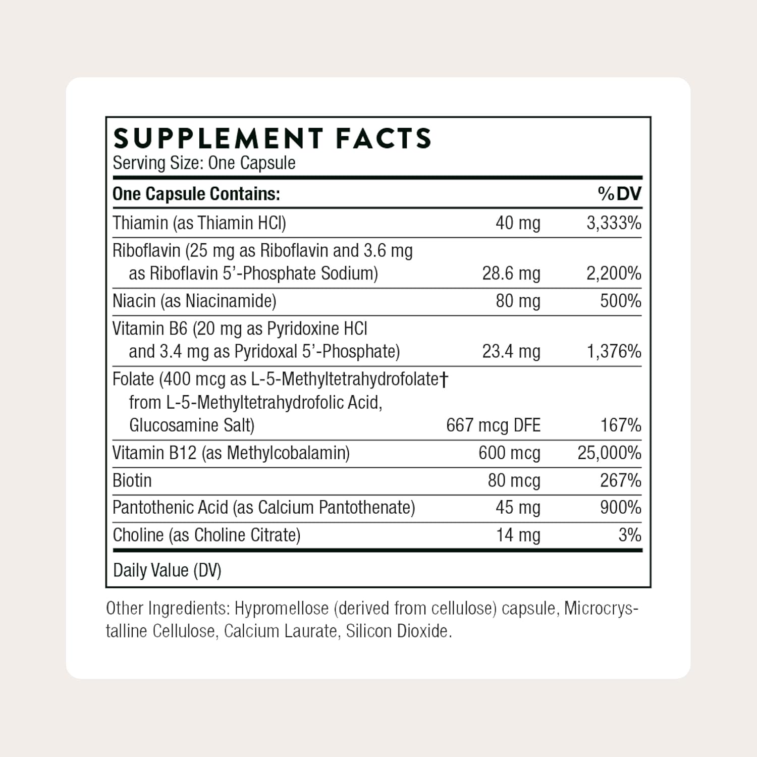 Complete Formula: An optimal balance of eight B vitamins with extra vitamin B12, plus choline, in their active forms to enhance absorption in the body*