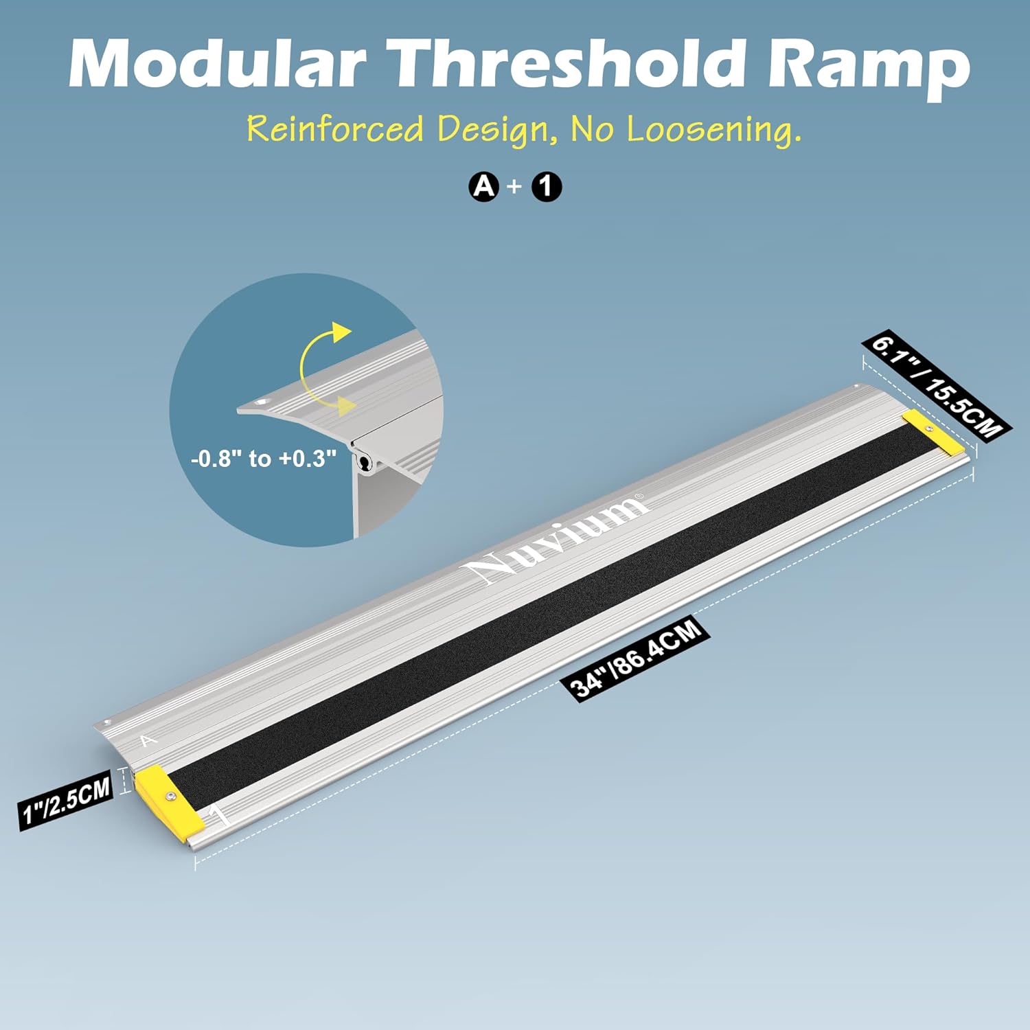 [Wide Application, Easy to Store] Use the wheelchair ramp at doorways, curbs, garages, patios, and more. When the entry ramp not in use, simply disassemble and stack the panels. Lightweight yet durable, the Nuvium aluminum threshold ramp stores compactly in your car trunk or closet—ready to go whenever you need it.