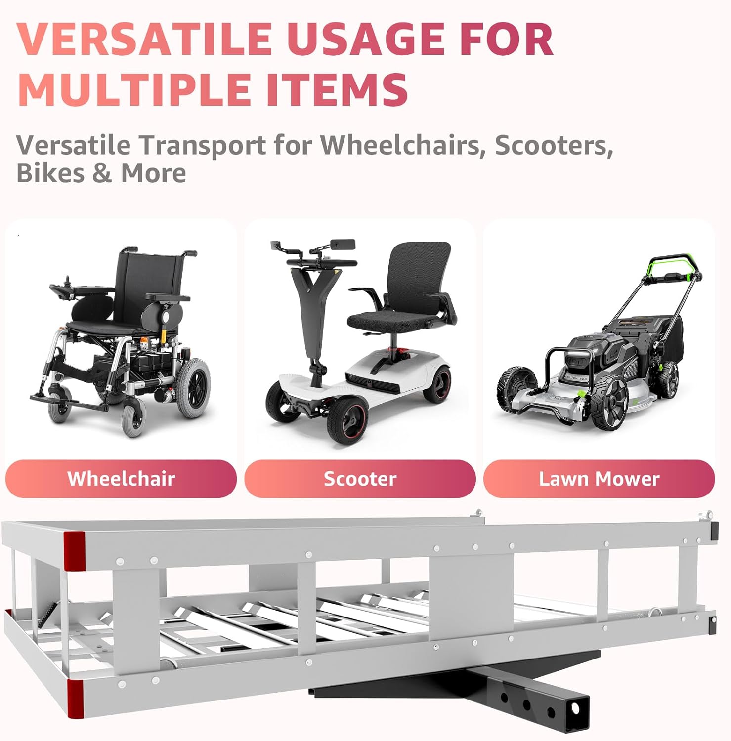 【CONVENIENT FOLDABLE RAMP】- Hitch cargo carrier equipped with a 41.5 inch extended ramp with a latch mechanism for quick deployment/folding, cargo carrier seamless loading and unloading of wheelchairs, scooters, lawn mowers, snowmobiles, and other heavy duty equipment saves time and effort.