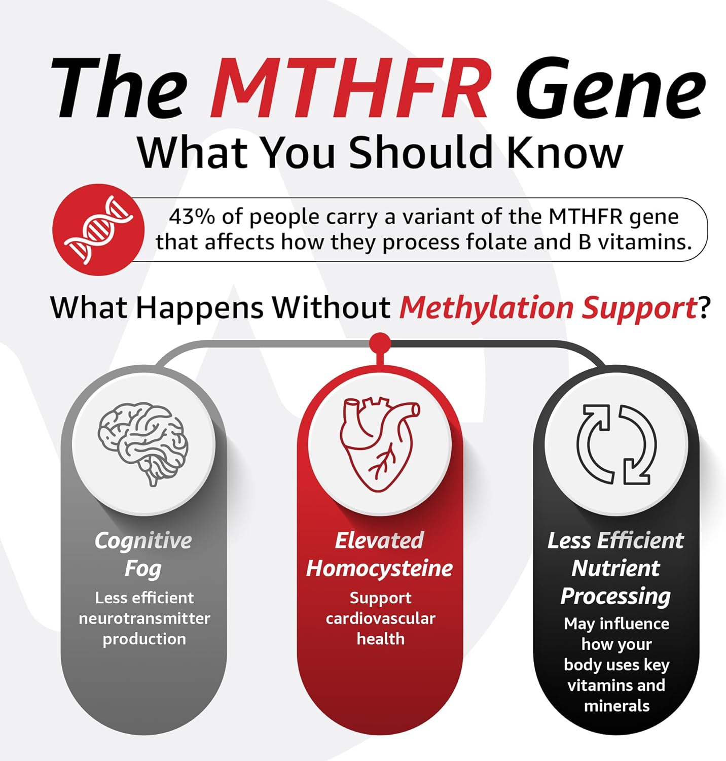 Essential Methylated Nutrients: Includes 5MTHF (methylated folic acid or methylfolate) with other methylated vitamins and Methyl B complex, such as riboflavin (B2), and pyridoxine (B6); supports straightforward daily routines without complicated stacks.