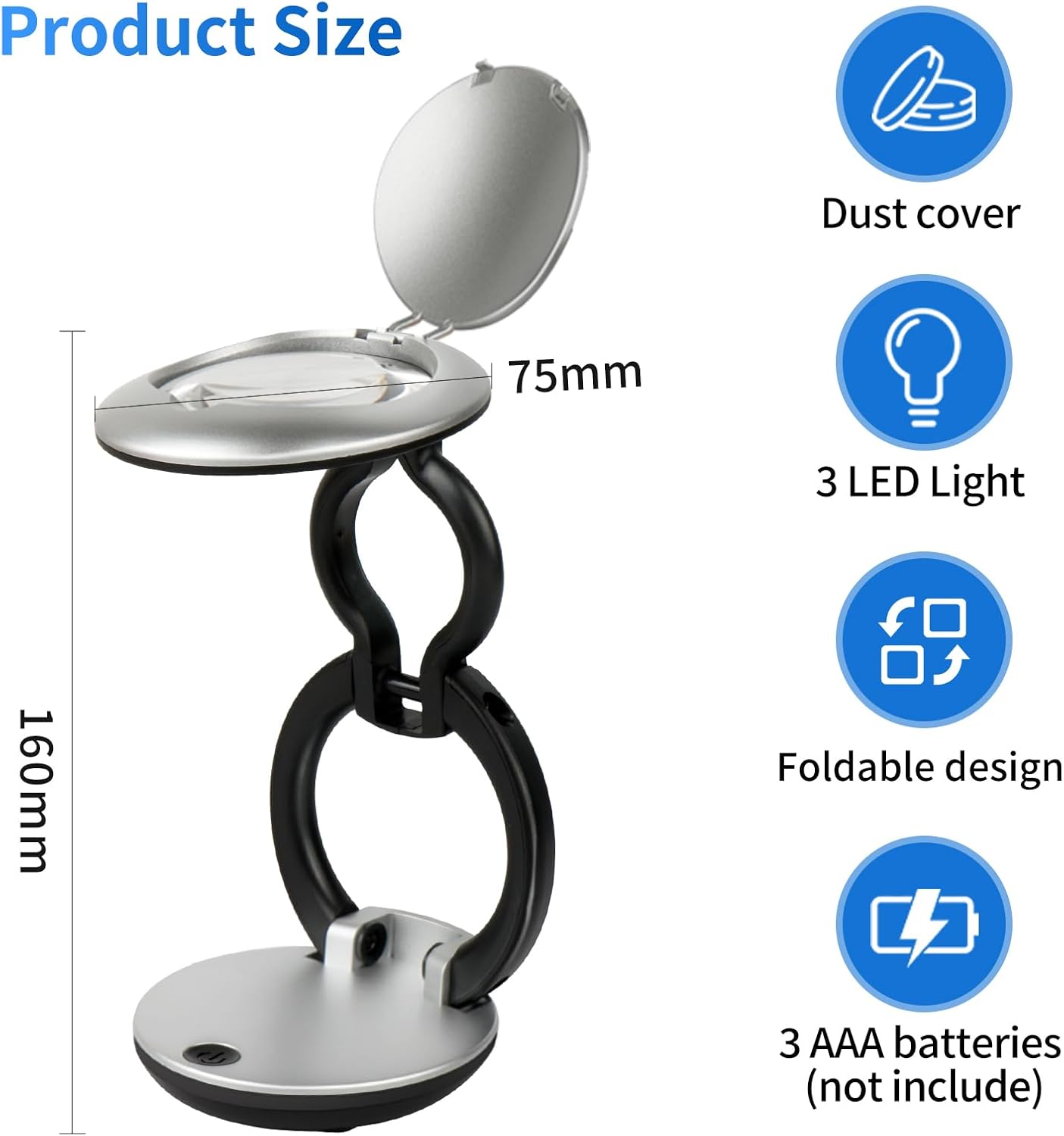 【FOLDABLE AND LIGHTWEIGHT】This magnifying glass is small and portable, foldable, and very suitable for carrying around. With its 10X Lens and three bright daylight LEDs, it provides excellent magnification and illumination for detailed work.