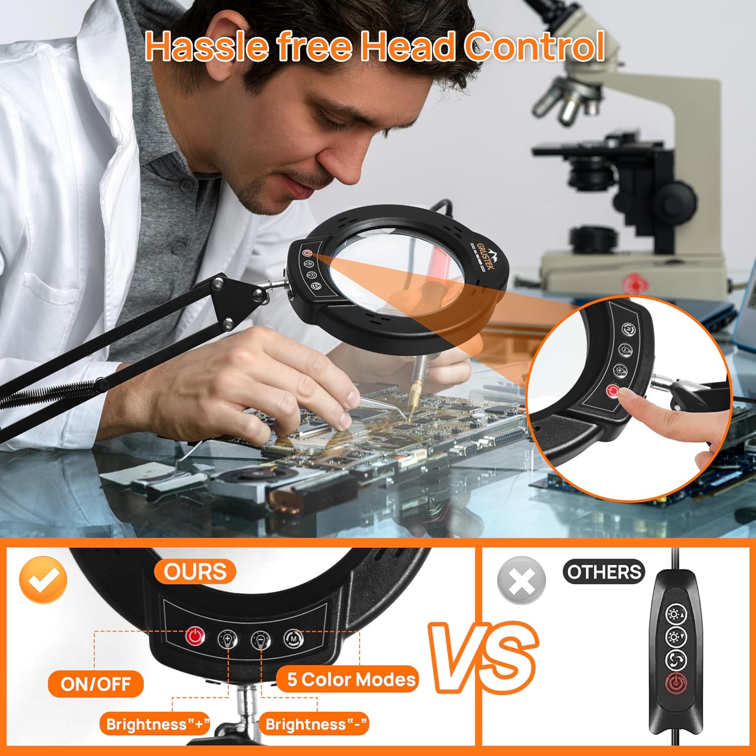 Magnifying glass with light features 84 LEDs (1200 lumens), 5 color modes (3000K-6500K) with 10 dimmable brightness levels for optimal illumination without glare or flickering. The memory function retains last setting when off but defaults to white if unplugged