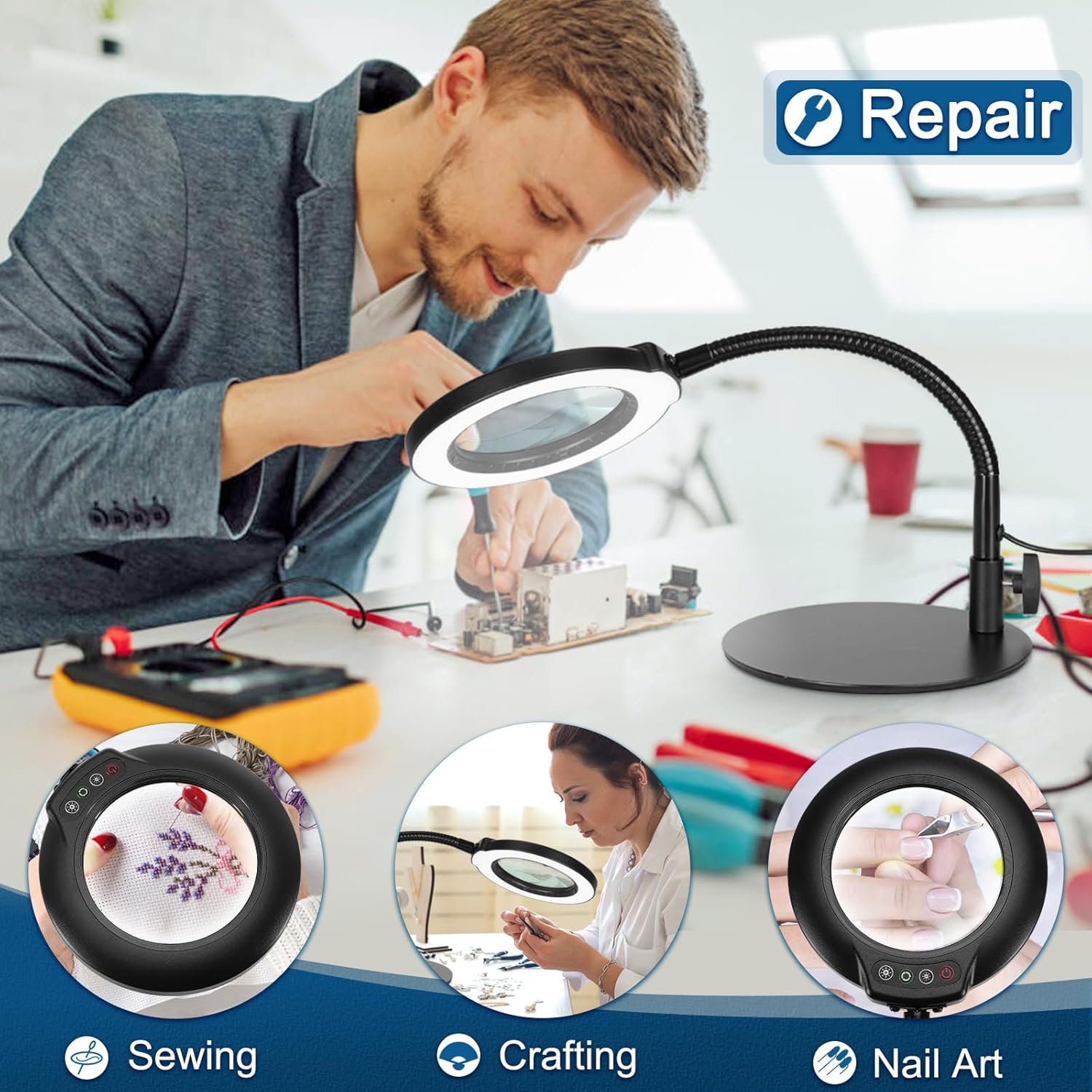 【A Good Choice for Seniors】 This magnifying desk lamp makes a thoughtful and practical present for seniors or individuals needing visual assistance due to conditions like low vision, macular degeneration, or visual impairment. Perfect for repairers, estheticians, artists, coin collectors, architects, jewelers, watchmakers, painters, sculptors, soldiers, crafters, aestheticians, manicurists and more. Enjoy life with freedom for your eyes and hands.