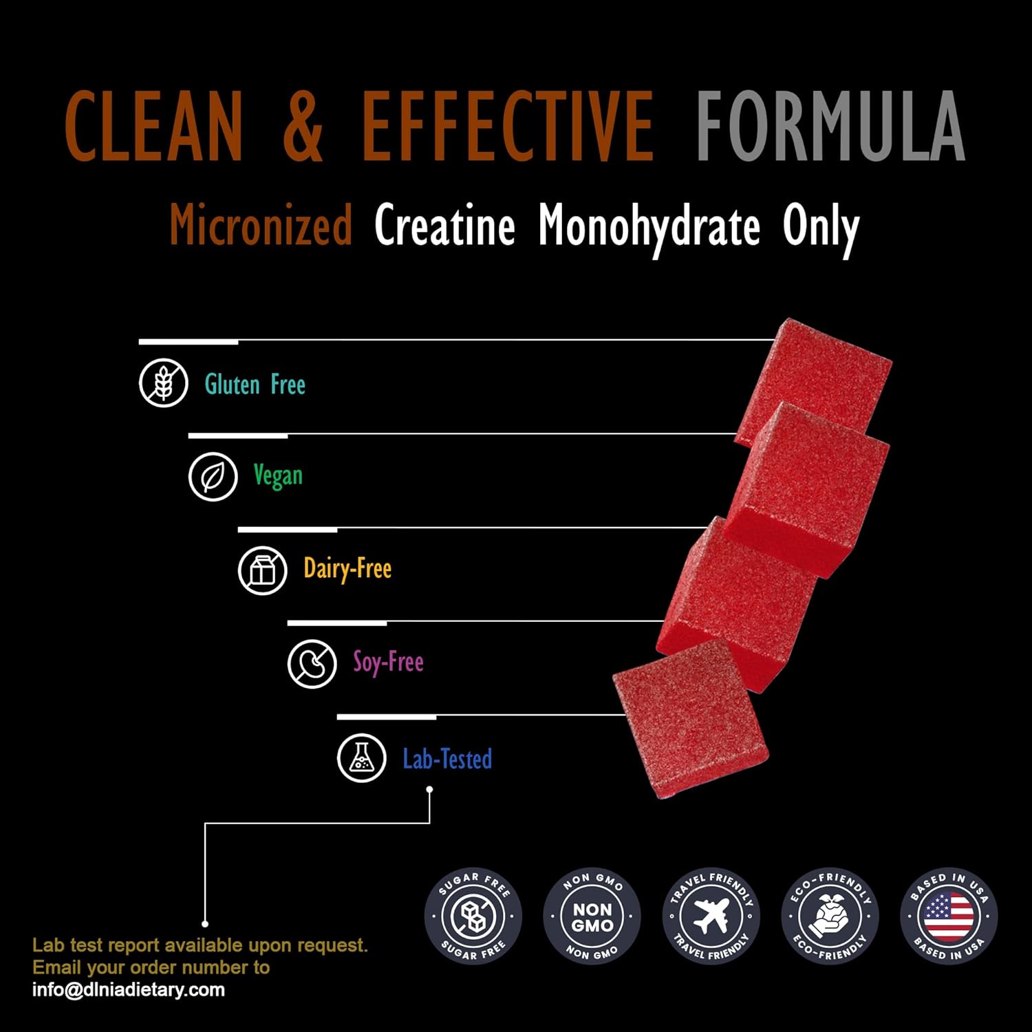 SATISFACTION GUARANTEE WITH EACH GUMMY: We use only 100% pure, vegan-friendly, & non-GMO ingredients, free from unhealthy additives; DLNIA creatine monohydrate gummies are 3rd party lab tested & packaged in a GMP certified facility to ensure efficacy, your safety & satisfaction