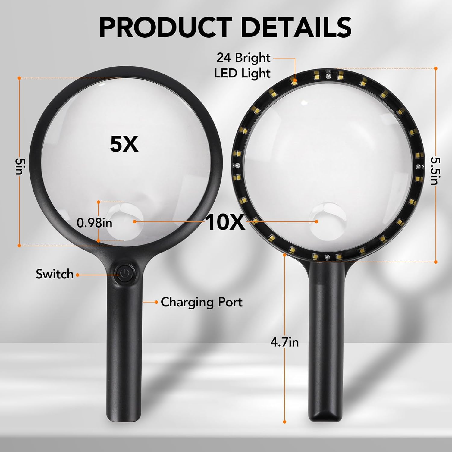 HD MAGNIFICATION & CLEAR DETAILS – This magnifying glass with light offers 5X + 10X magnification, ideal for reading small print, checking medicine labels, and needlework. The optical-grade PMMA lenses with an anti-glare design deliver distortion-free, blur-free clarity for precise close-up viewing