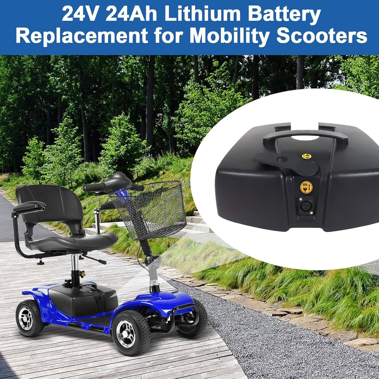 Easy Carry and Replacement: 24Ah high capacity lithium battery is light, the lightweight design makes the batteries easy to install and remove, which can also reduce the weight of the vehicle body, and provide stable performance. The 24V Lithium battery has a long charge and discharge cycle life, it can cycle 1000 times and extend the use time of the mobility scooter.
