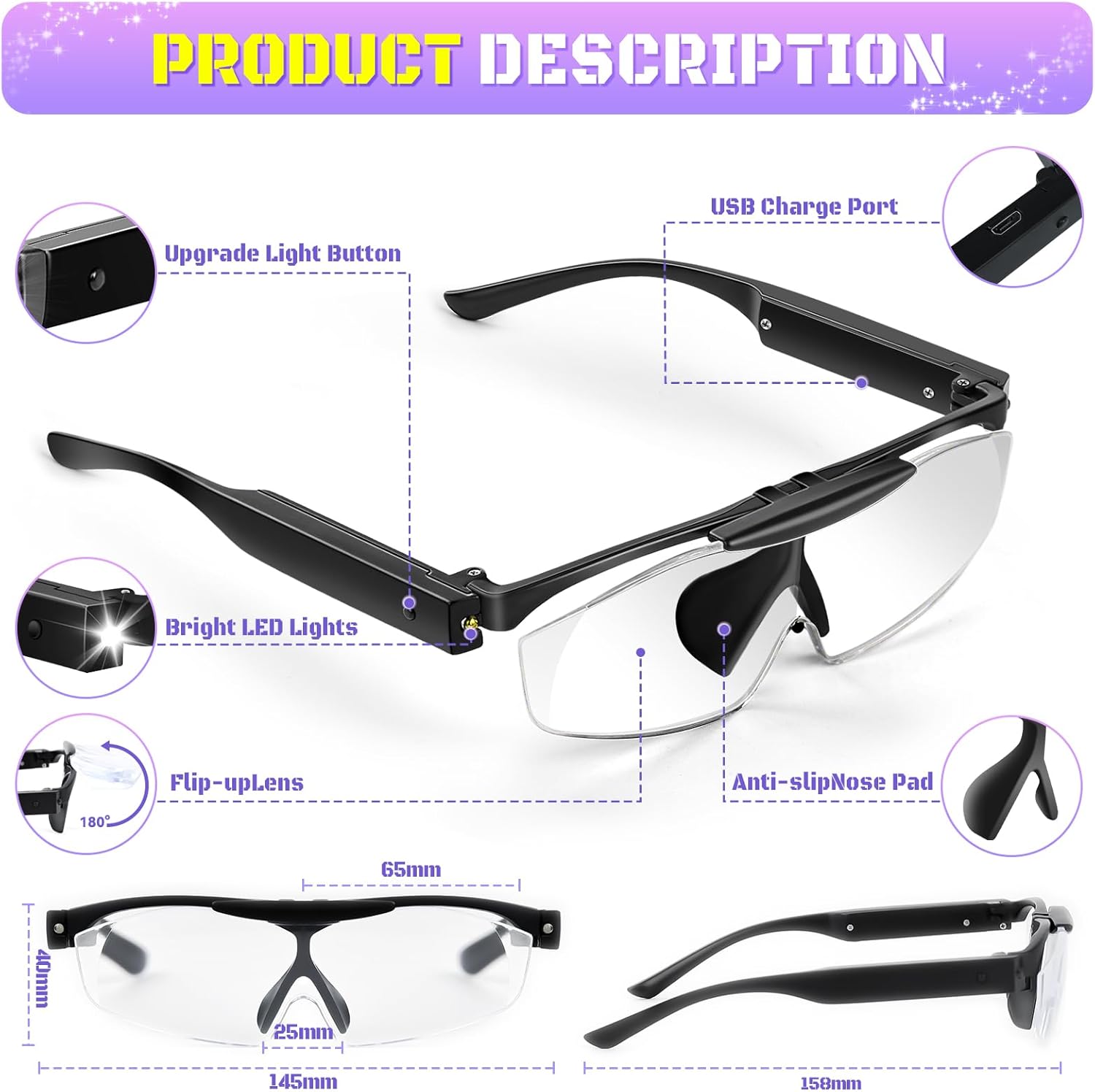 LIGHTWEIGHT AND COMFORTABLE FLIP-UP MAGNIFIER: This flip-up magnifier features an ergonomic frame design with a non-slip nosepiece that is as lightweight and comfortable to wear as regular eyeglasses. Lightweight and comfortable to wear, you won’t feel uncomfortable even after long time wearing.