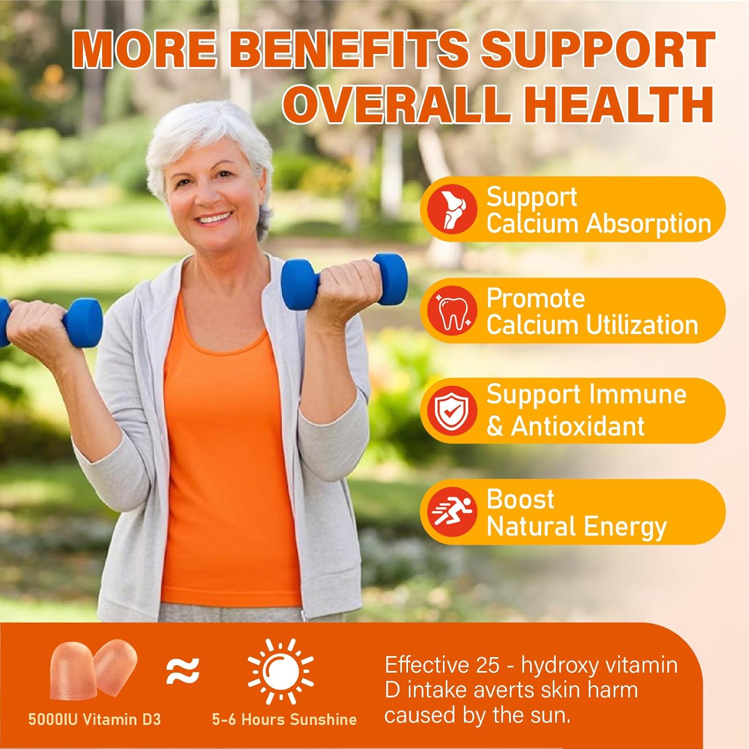 ENERGY PRODUCTION & IMMUNE SUPPORTS: The Vitamin D Was unlike other immune support nutrients like Vitamin C, it’s nearly impossible to get the 5,000IU-10,000IU of Vitamin D you need each day from food. The proper absorption of calcium that we all know is so important as we age. Without vitamin D3, you may be missing out on benefits from the calcium in your diet. While Vitamin D ensures that calcium is absorbed from the diet, vitamin K2 helps support your body in directing it to areas Various parts of the body, so it can be put to good use.