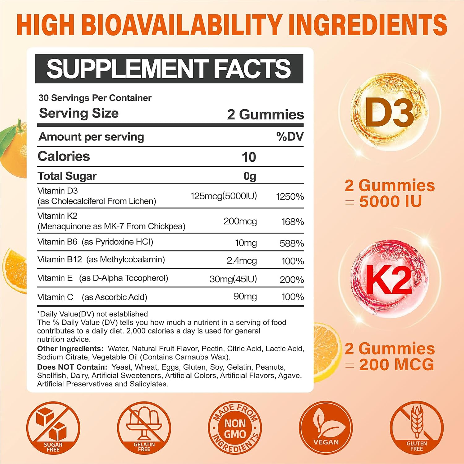 NATURALLY SOURCED AND VEGAN: These vitamin D3+vitamin K2 gummies are sugar-free, but is made with xylitol & erythritol and has 40% fewer calories than sugar. Vegan and Non-GMO, natural ingredients without any artificial flavors, colors, or sweeteners which is vegan, vegetarian friendly, free of starch, soy, yeast, wheat, egg, artificial color, flavor, and preservatives.