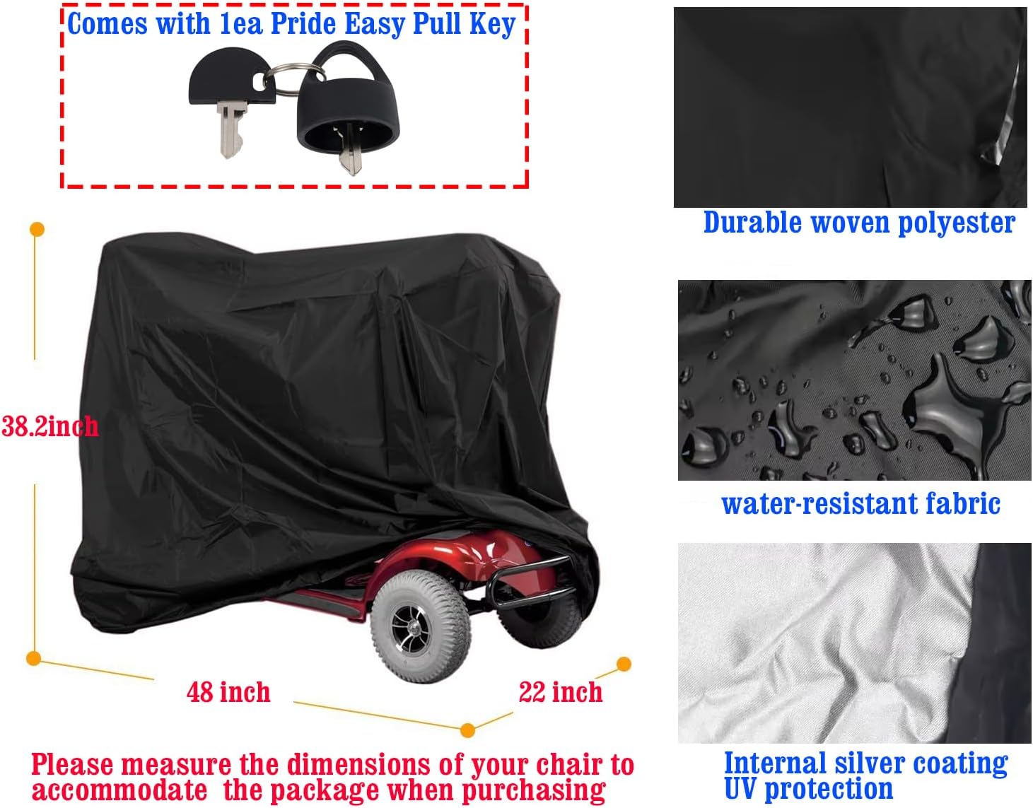 4.This cover is compatible with most 3-4wheel mobility scooters, Wheelchairs and Electric scooters on the market. Comes with 1ea Pride Easy Pull Key,