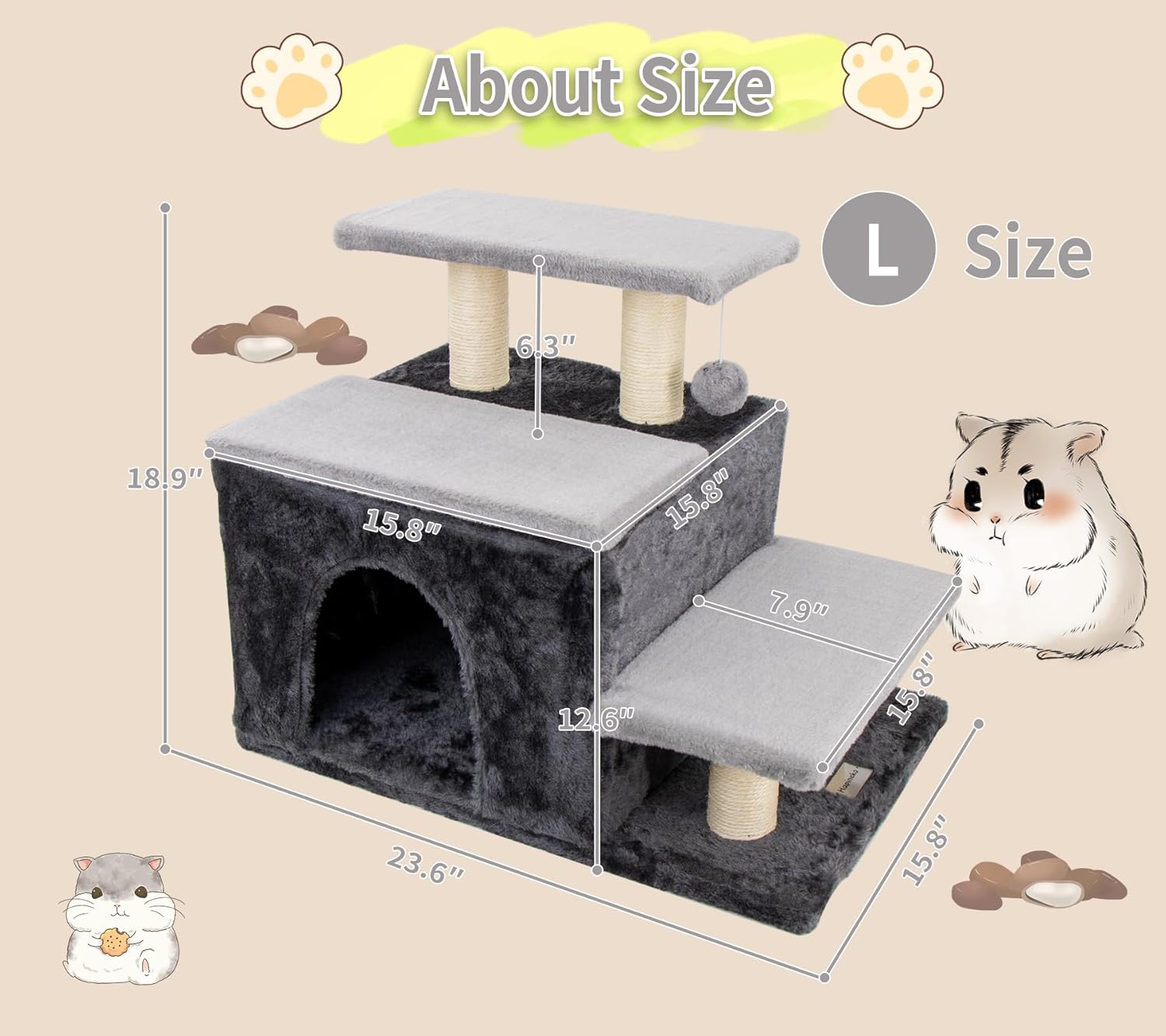 🐱【Spacious Condo – Ideal for Maine Coons, Large & Chubby Cats】: Our L-size model features an extra-wide cat condo (15.7″ x 15.7″ x 12.6″) that easily accommodates Maine Coons, extra-large, or chubby cats who need more room to stretch out. The M-size condo (12.6″ x 12.6″ x 12.6″) also offers ample space, making it perfect for regular-sized and overweight cats who enjoy a roomy, cozy bed. Both sizes include soft, removable cushions in the bed and on the steps, providing a comfortable, supportive resting spot for cats of all shapes and sizes.