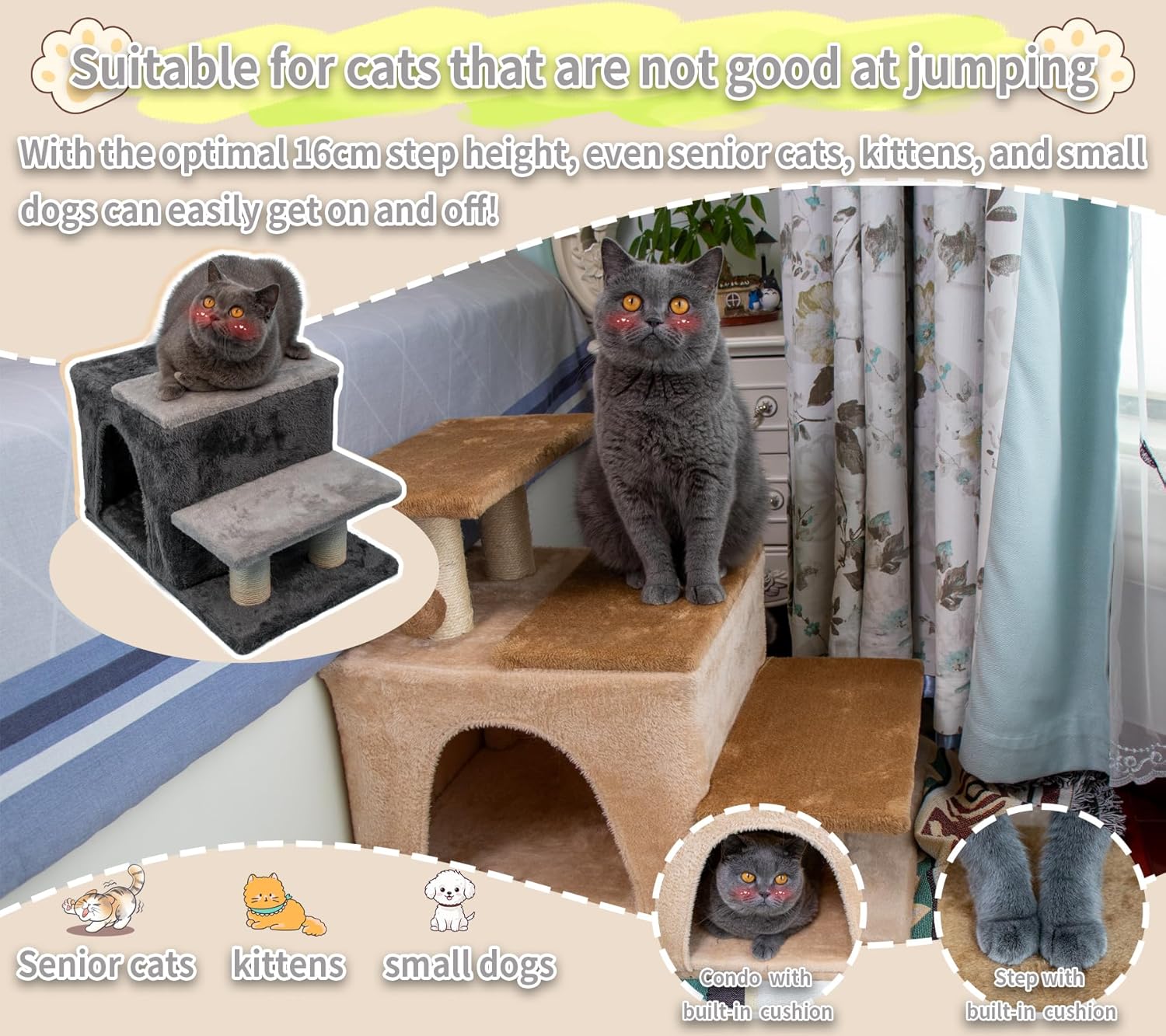 🐱【Senior & Disabled Pet Friendly – Joint Care Steps】: Featuring three 6.3 inch steps, our dog and cat stairs support easy climbing for senior pets, kittens, and pets with limited mobility. The plush, non-slip cushions on both the stairs and condo protect sensitive paws and joints, promoting safe and independent access to high beds, sofas, or window sills.