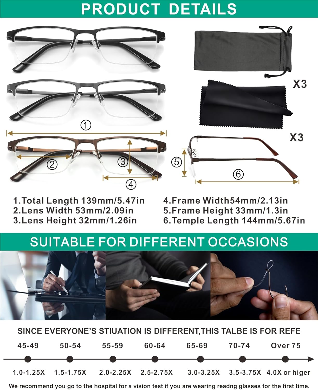 Comfortable And Handy: Our readers don’t have thick rims to block vision partially, sleek design, well made, new style thin metal semi-frame, comfortable to wear. Spring hinges arms for sturdy, the silicone nose pads don’t slide down, fit great on your face. 3 pairs handy in different places, 3 separate cleaning cloths included, but ALSO 3 separate pouches to store each pair of glasses in! No more looking for extra or old storage pouches or cleaning cloths because there’s enough provided here!