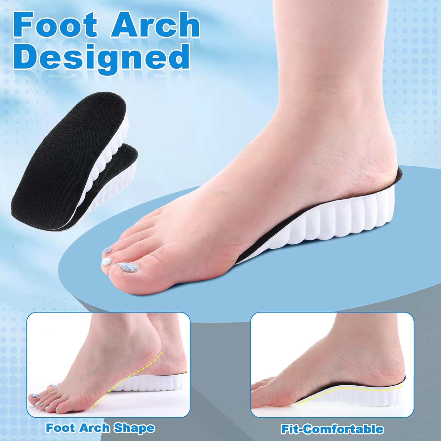 Packing Quantity: you will receive 3 pairs, or 6 height increase insoles, which can increase your height by 1.4 inches; They fit most shoes and are soft and comfortable, providing excellent support and comfort for your feet