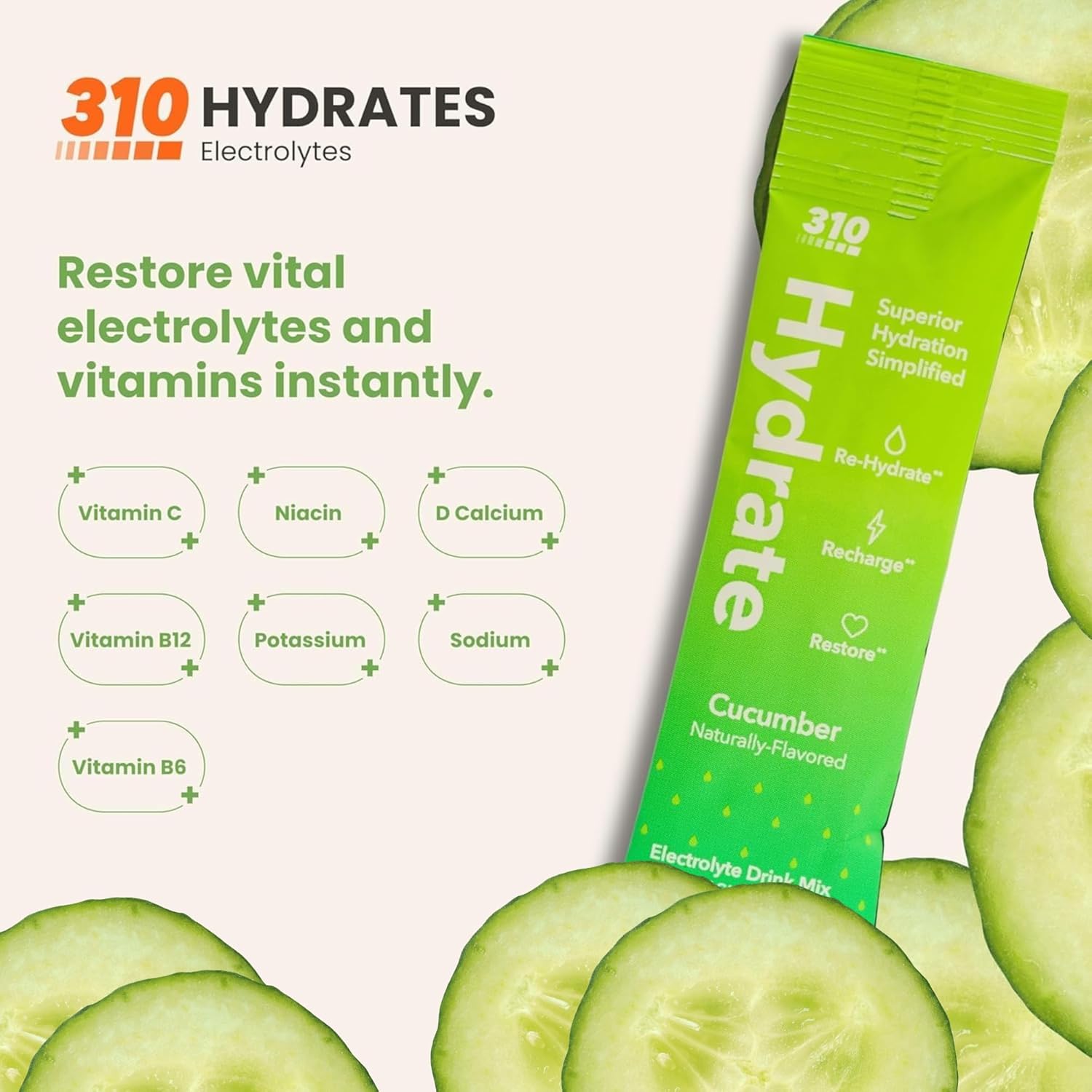 BOLD AND DELICIOUS VARIETY: Available in refreshing flavors like Cucumber, Lemon Lime, Peach Mango, Strawberry, Wildberry, Watermelon, and Tangerine. 310 electrolyte drink mix is packed in convenient single-serve packets for hydration anywhere you go