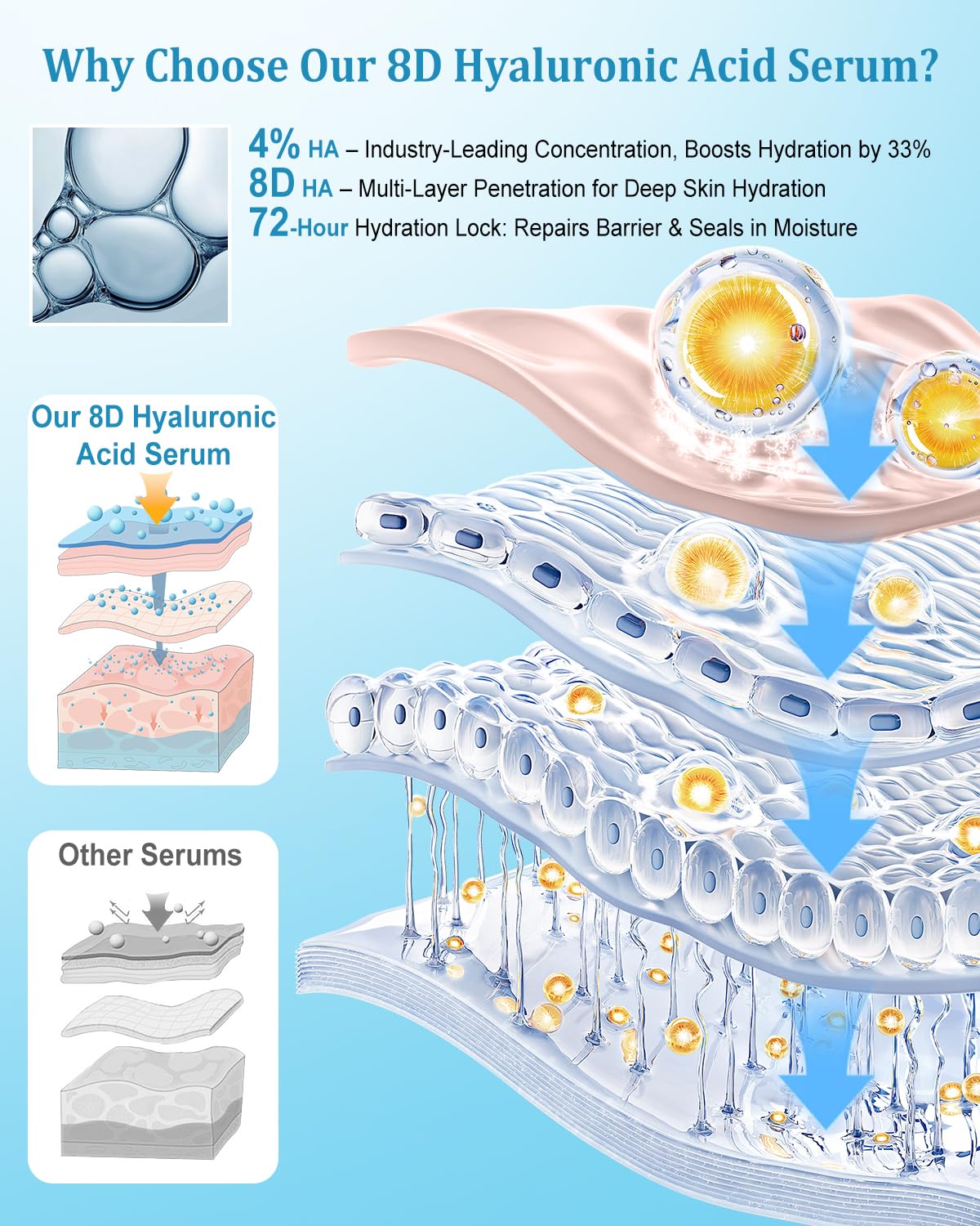 8D Hyaluronic Acid Hydration Serum – 72-Hour Moisture Lock: Formulated with 4% 8D HA complex, this serum uses 8 molecular weights to deliver multi-layer hydration. It draws and holds water, supports the skin’s natural moisture barrier, and leaves skin soft, plump, and comfortably hydrated. Boosts moisture retention and provides deep hydration across each of your skin’s layers.