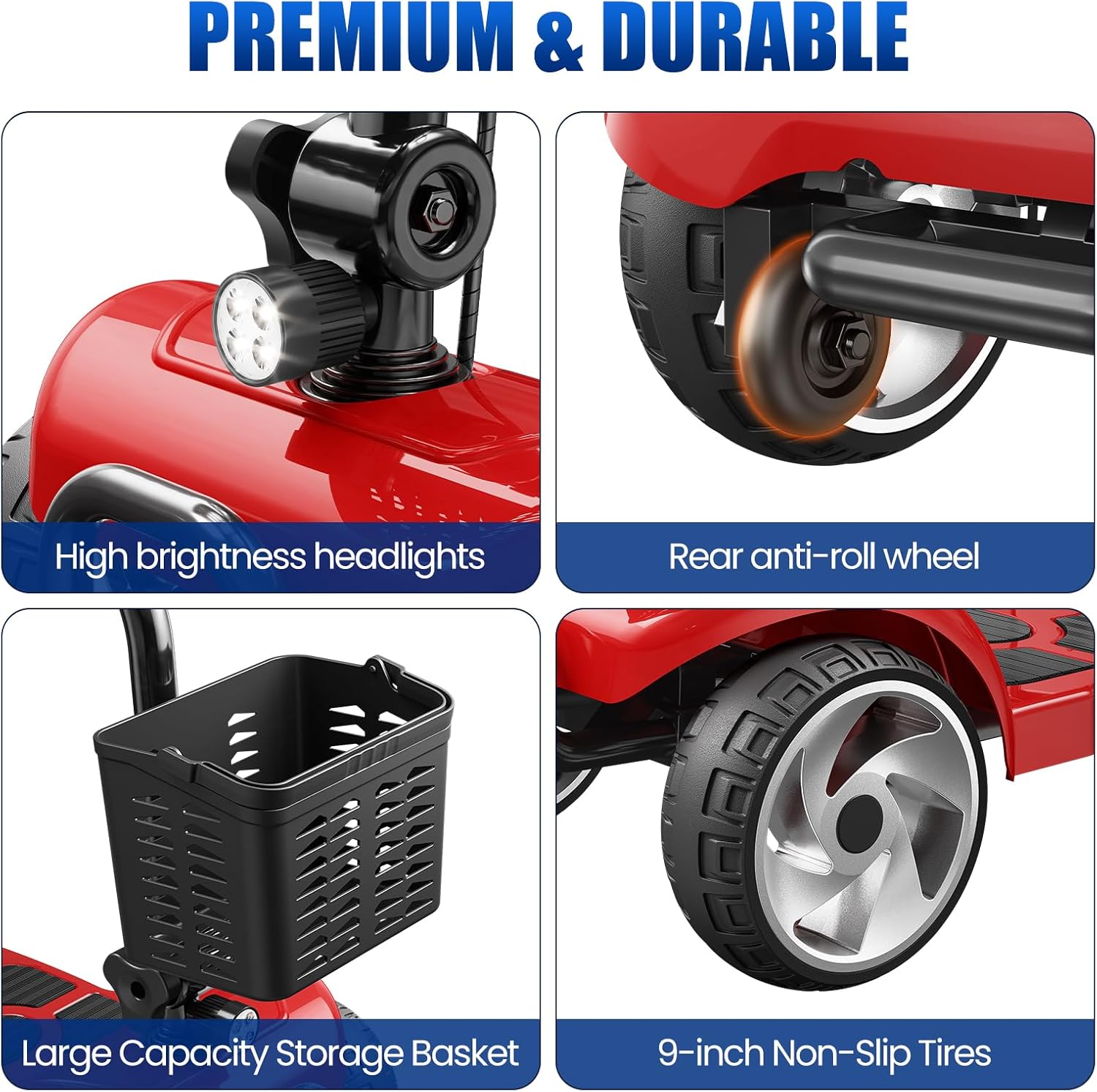 【Safety System】 Choose between electric drive and manual push modes to suit your needs. The smart electronic brake ensures reliable stopping power. Added safety is provided by anti-tip rear wheels, reinforced front bumper, bright LED headlight and a sturdy storage basket.