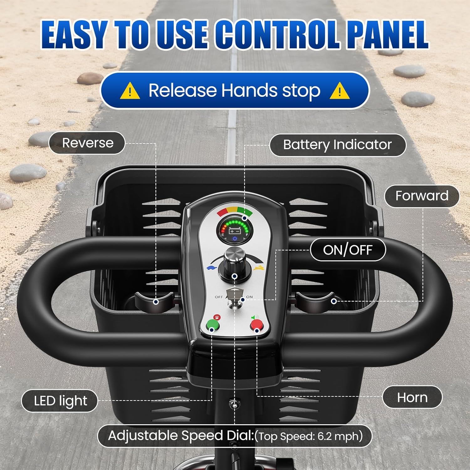 【Intuitive Control Panel】 Operate with ease using the smooth speed control knob, convenient forward/reverse lever, bright LED headlights, and horn. The color-coded power display keeps the battery status clear at a glance. 2 start-up keys are included for security and convenience.