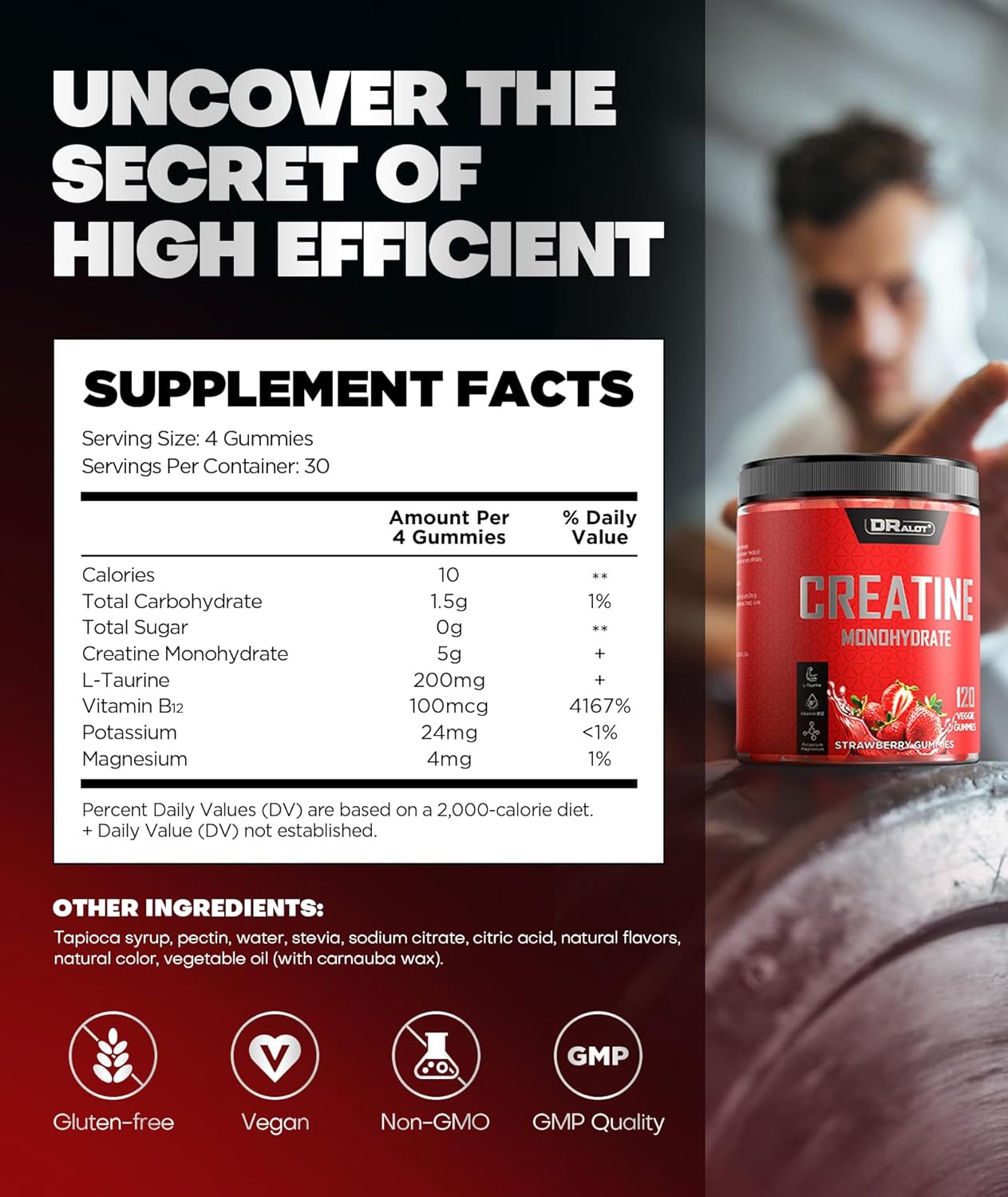 ULTRA PURE CREATINE MONOHYDRATE, NEXT-LEVEL MUSCLE SUPPORT! Tired of energy run-down, muscle plateau, and long recovery? Compared to other creatines, our Creatine Monohydrate is refined with ultra-fine mesh technology, which can accelerate ATP regeneration, ensuring faster absorption and maximum muscle growth. Crush your limits with Dralot Creatine Monohydrate Gummies! Say goodbye to slow progress and hello to explosive strength, lightning-fast recovery, and unstoppable endurance!