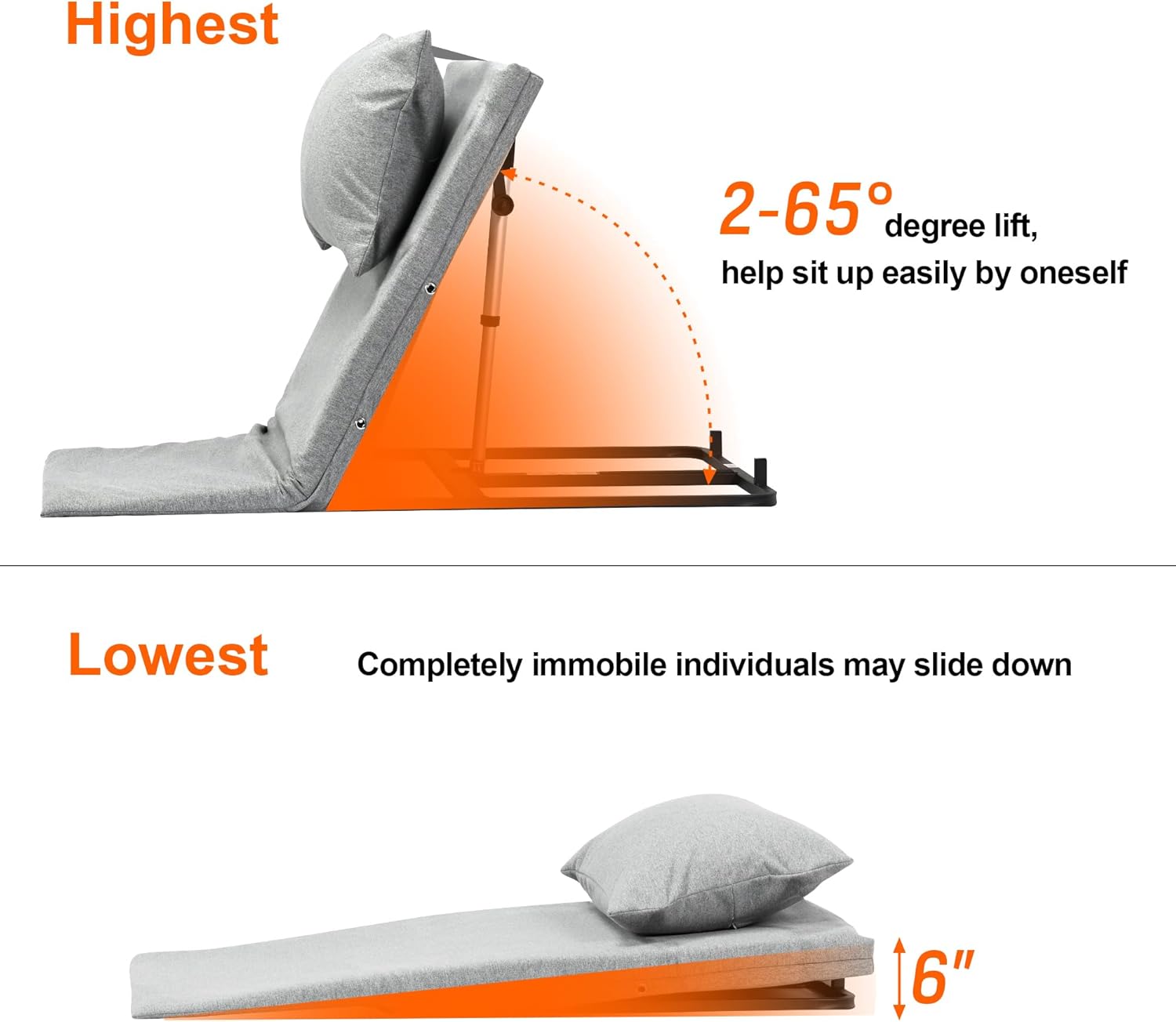 The power lifting bed backrest with remote control adjust between 2-65 degrees, helping people with difficulty in getting up in bed, reducing the force on the waist, and not having to be supported by family members to get up or lie down.