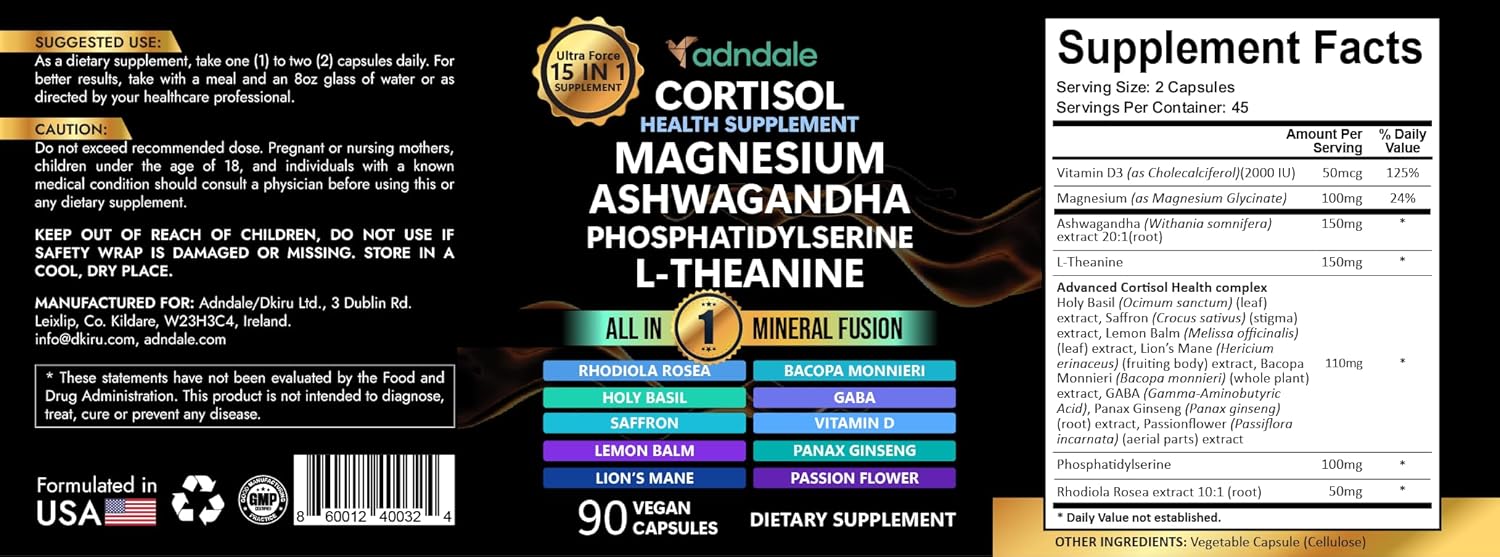 CORTISOL REDUCER FORMULA: 14-in-1 cortisol supplements for women and men to support a healthy stress response and overall well-being. Includes Ashwagandha, Rhodiola Rosea, Phosphatidylserine, and Magnesium Glycinate; plus GABA, L-Theanine, Holy Basil, Panax Ginseng, and Passionflower for calm and balance.*