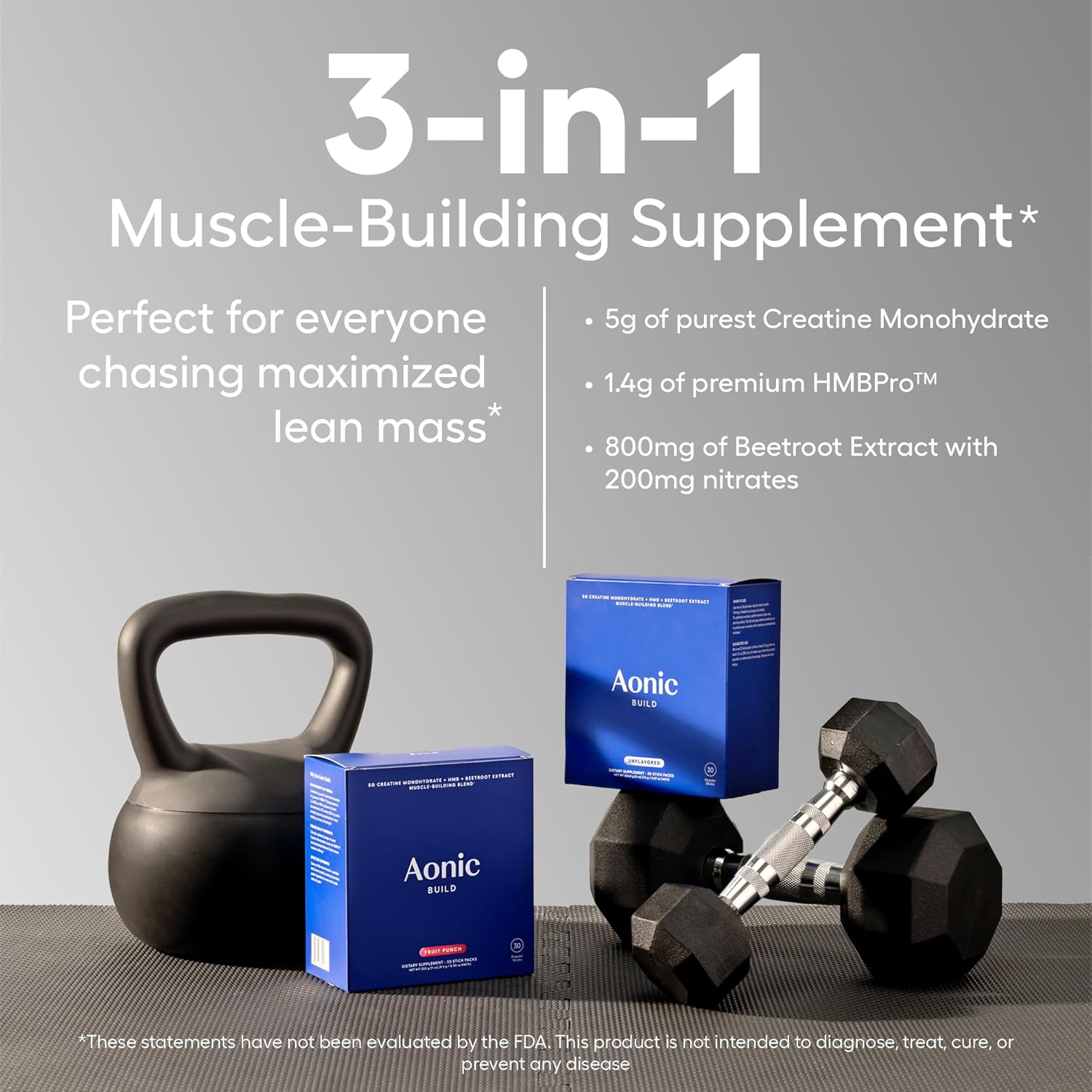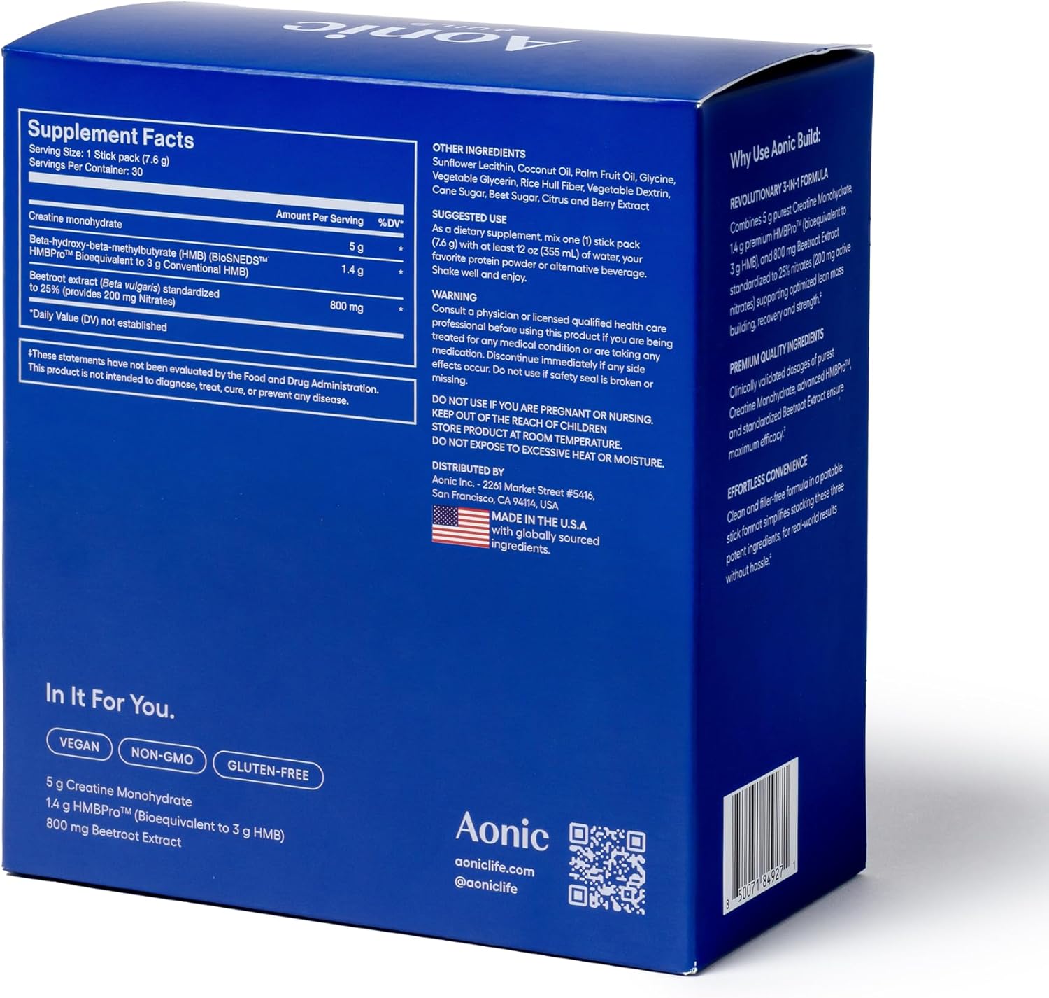 Aonic Build is a 3-in-1 creatine-based supplement designed to support active lifestyles. Each easy-to-use stick pack combines 5g Creatine Monohydrate, 1.4g premium HMBPro (bio-equivalent to 3g HMB based on human PK studies), and 800mg Beetroot Extract (200mg Nitrates) in a convenient daily formula. This clean, vegan, non-GMO blend is ideal for those who value strength training, recovery, and balanced nutrition – offering a smart way to complement your workouts.