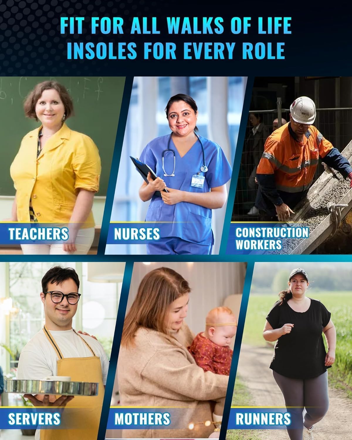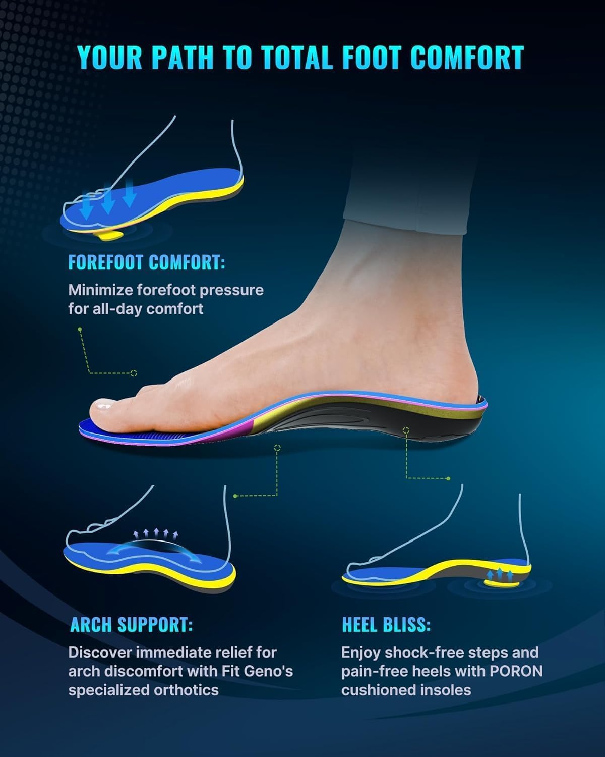 Heavy-Duty Support: Fit Geno plantar fasciits insoles are meticulously crafted for those over 220lbs, providing robust high arch support and innovative shock guard technology to alleviate foot, leg fatigue, and reduce lower back pain