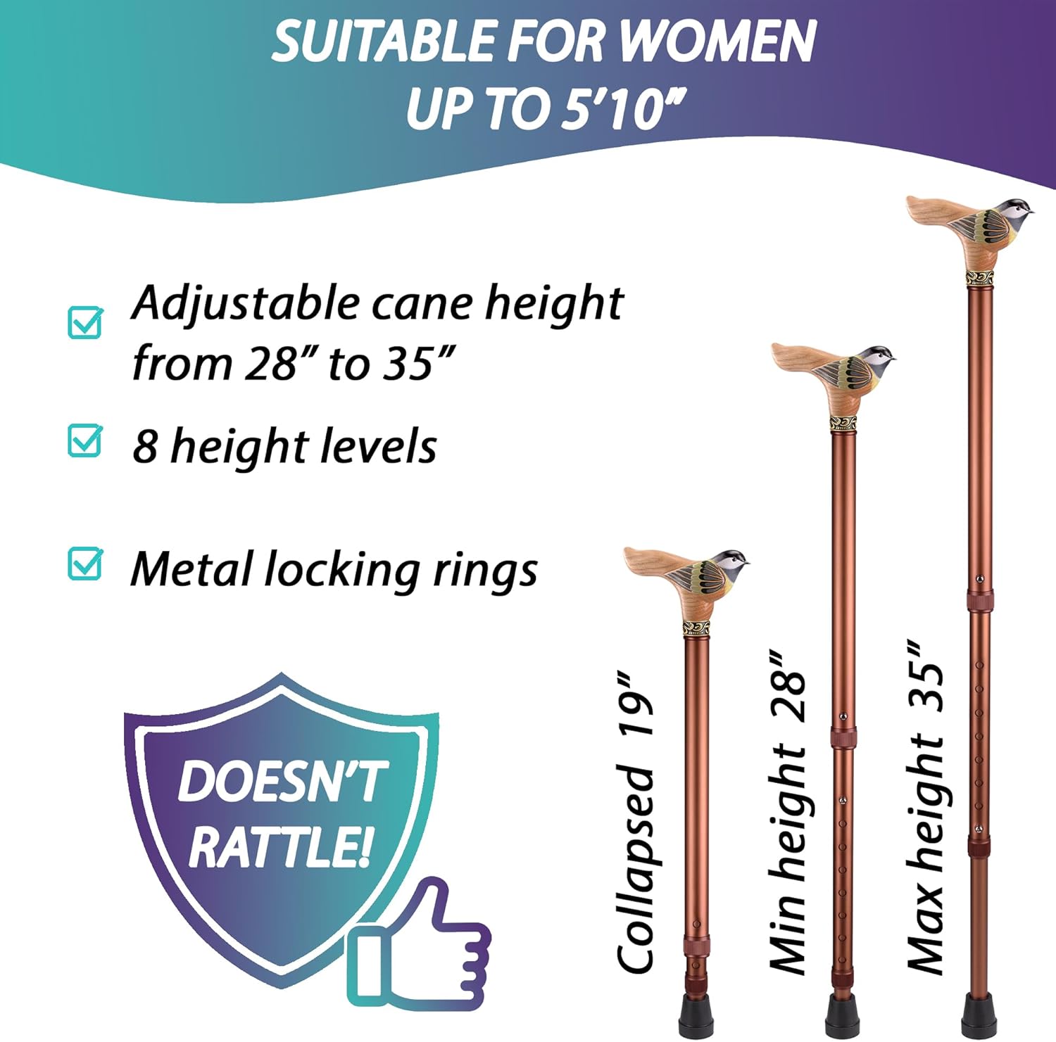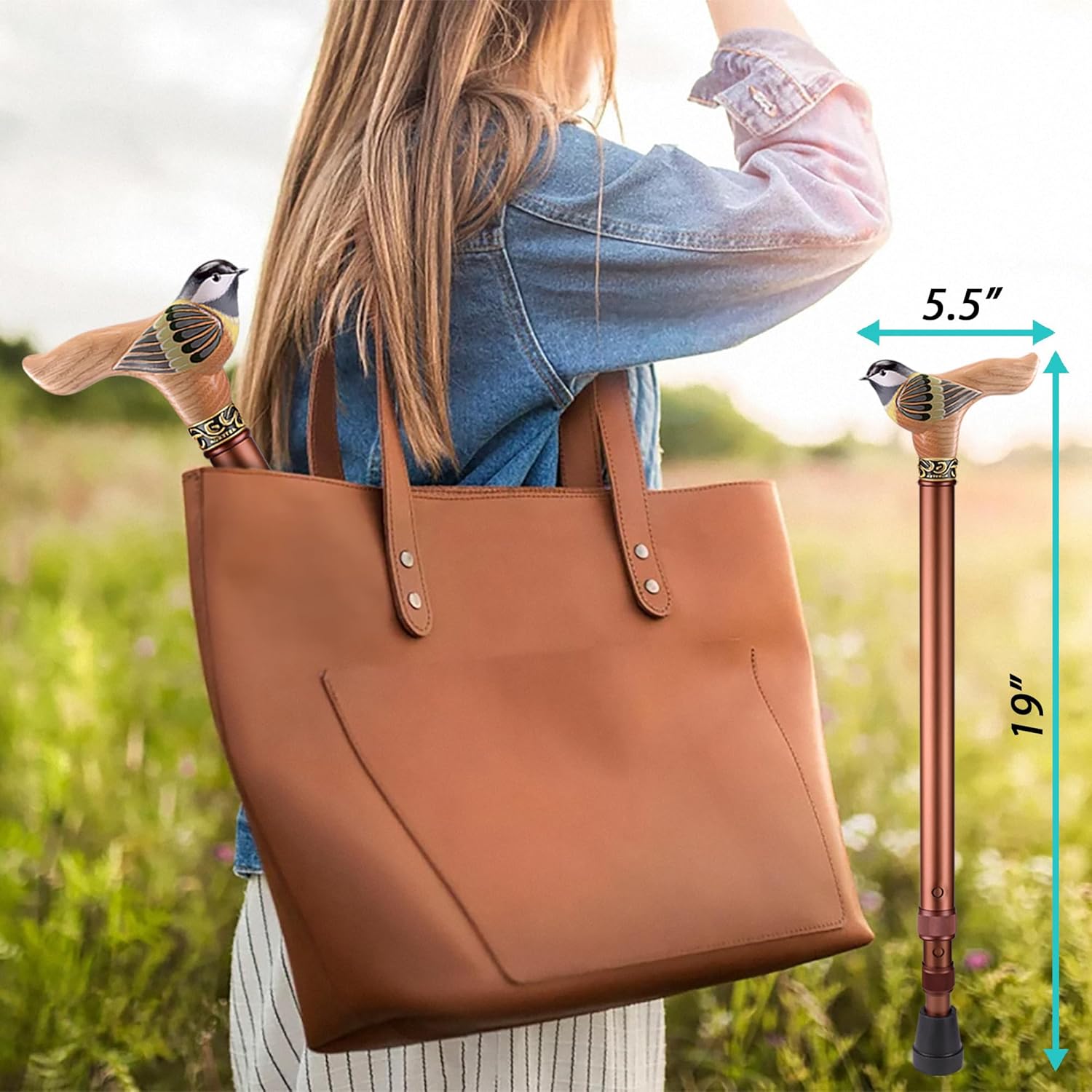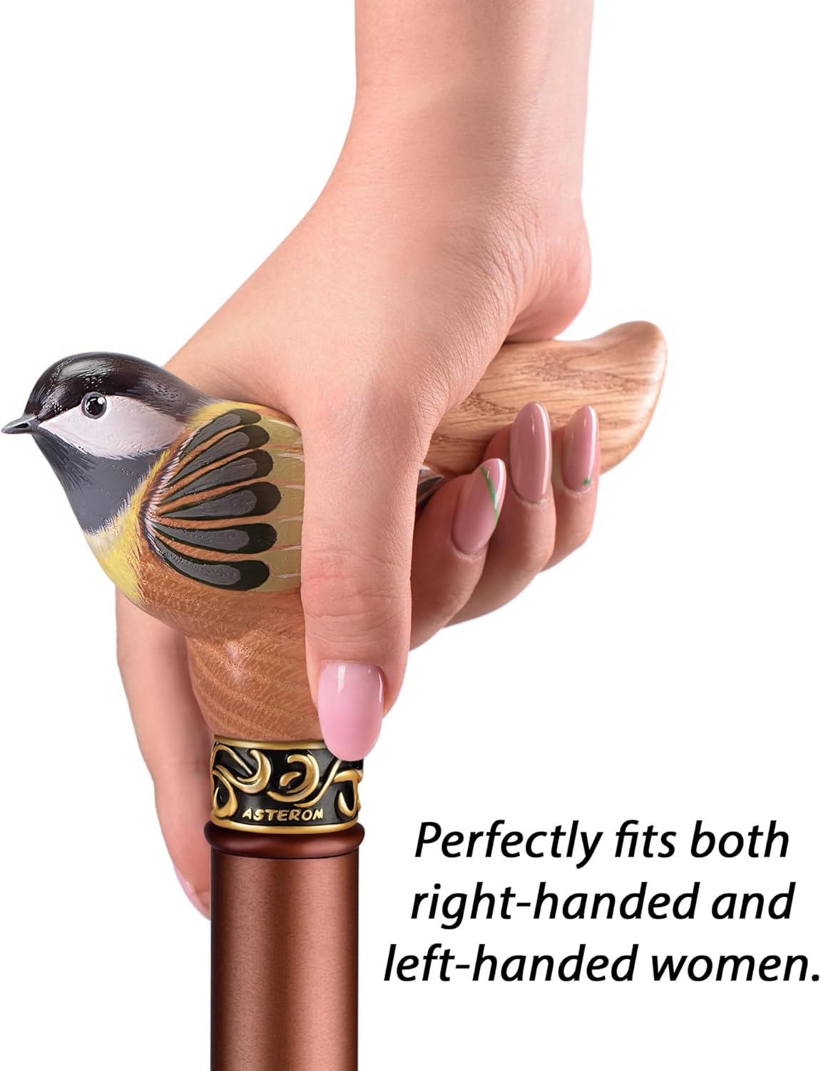 Style Expression – Elevate your look with our fashionable walking cane for women. Its elegantly painted-by-hand wooden handle ensures you stand out from the crowd, while the ergonomic bird-inspired design provides a comfortable and secure grip.