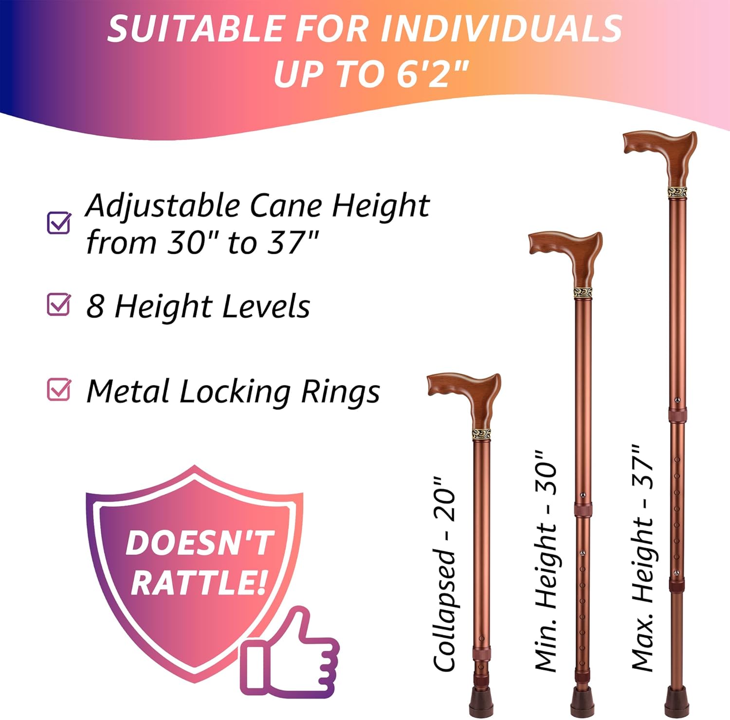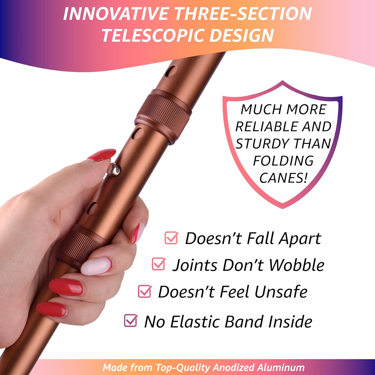 Reliable Telescopic Design: Our walking canes for women offer greater security and comfort compared to standard folding canes. Combining style with portability, our three-section telescopic design ensures effortless height adjustment, long-lasting durability, and everyday convenience.