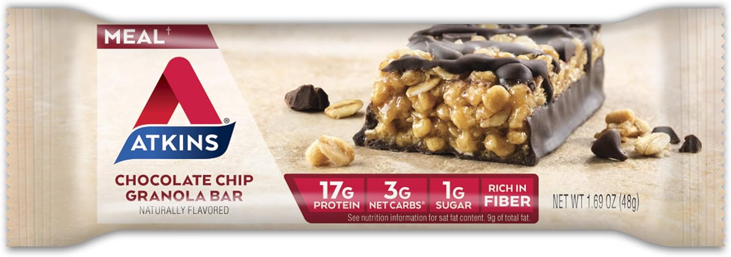 AT HOME OR ON-THE-GO. Atkins Chocolate Chip Granola Protein Meal Bars. Enjoy delicious meal bars that fit right into your busy schedule, with 17g of protein, 1g of sugar, and 3g of net carbs per serving*. This is Today’s Atkins.