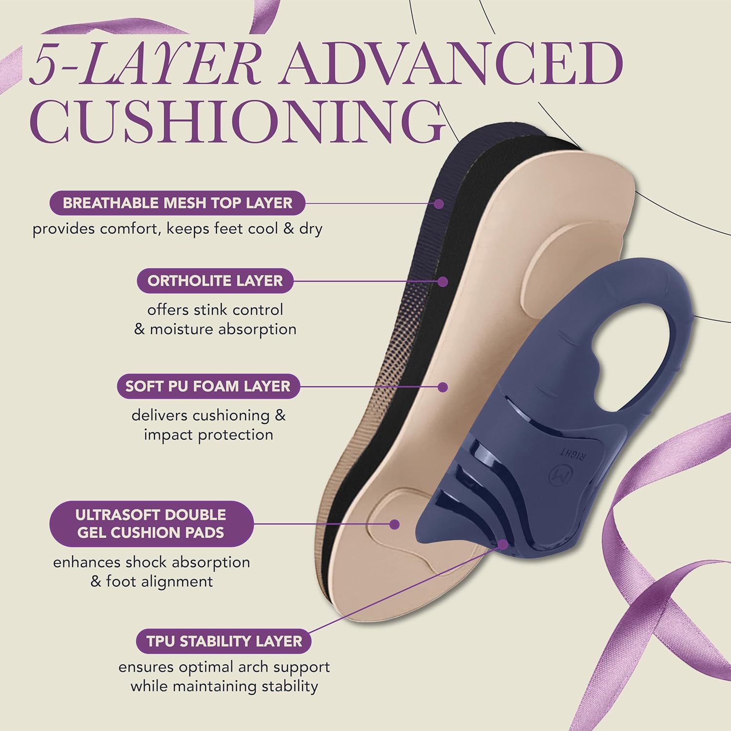 5 LAYERS OF ALL-DAY COMFORT: Experience cloud-like cushioning with our advanced arch insoles. Each layer of our orthotic inserts for women & men works together to alleviate foot discomfort, making them ideal for durable and extended wear.