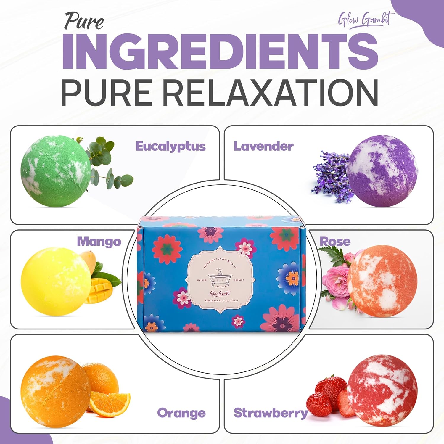 WHAT’S IN THE GIFT BOX: The Glow Gambit bath bomb gift set includes 6 unique fragrances and colors: Rose (Pink), Lavender (Light Purple), Eucalyptus (Green), Mango (Yellow), Strawberry (Light Red), Orange (Light Orange).