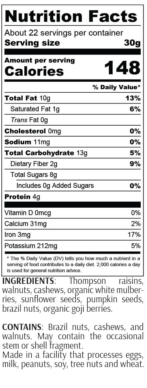 We removed the raisins and added organic, unsulfured and unsweetened coconut chips instead. Together with low-sugar dried organic mulberries and goji berries, this better-for-you blend is like a tropical vacation for your taste buds, all while feeling better.