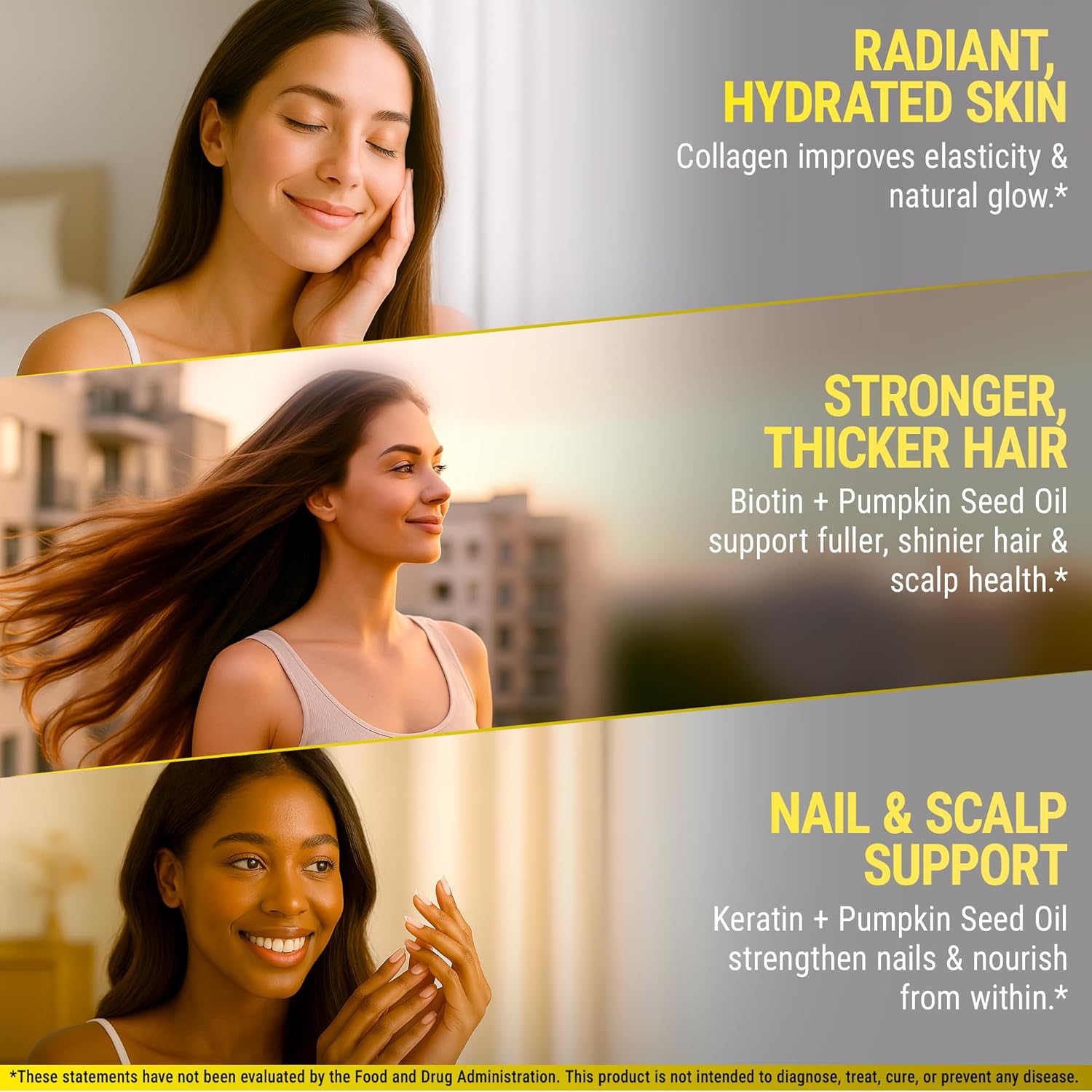 🧬 Synergistic Beauty Complex: Biotin pairs with collagen and keratin to support strong strands, healthy-looking skin, and resilient nails.*