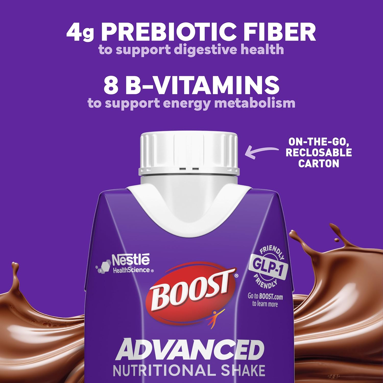 BOOST Advanced Nutritional Protein Shake is carefully designed by experts to support nutritional needs during weight loss^, including those on GLP-1s, dieting, or exercising. Help nourish your body with 35g high quality protein to help preserve muscle, 4g prebiotic fiber for digestive health, and 8 essential B vitamins to support energy metabolism. Whether you’re looking for nutritional support while on a weight management journey, or to fuel an active lifestyle, BOOST Advanced Nutritional Protein Shake is formulated with essential nutrients to help advance your goals. Available in convenient, ready-to-drink cartons. These nutritional shakes are available in both Rich Chocolate and Very Vanilla flavors and are Kosher and Gluten Free. ^When incorporated into a weight management plan that includes diet and exercise. *35g high-quality protein to support muscle health; 4g Dietary Fiber to support digestive health; 8 B-Vitamins to support energy metabolism. NOTICE: USE THIS PRODUCT AS A FOOD SUPPLEMENT ONLY. DO NOT USE FOR WEIGHT REDUCTION. ADD TO YOUR DIET TO INCREASE PROTEIN DURING WEIGHT LOSS. USE THIS PRODUCT AS PART OF A NUTRITIONALLY BALANCED DIET WITH EXERCISE.