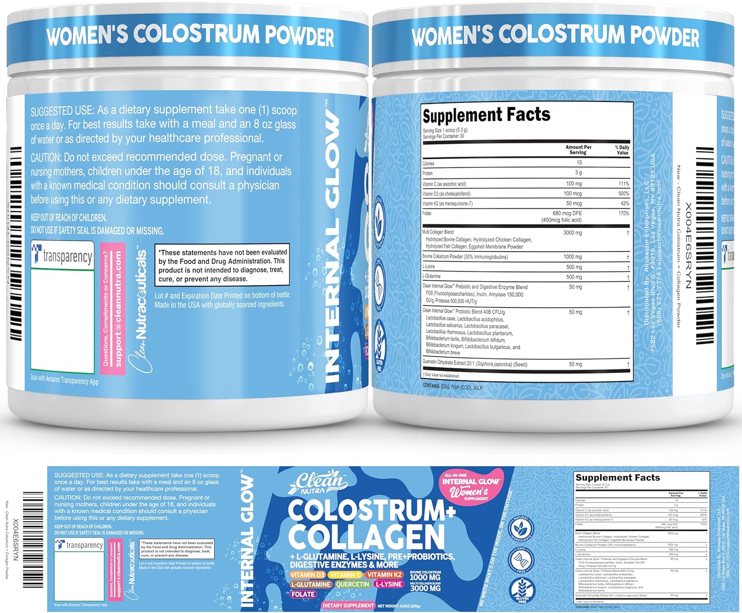 Colostrum + Collagen Powder For Women: Bovine collagen powder features a carefully selected blend of vitamins and minerals. This multi-nutrient formula includes folate 400mcg, vitamin D3 5000 IU, L-glutamine, and quercetin complex. Colostrum supplement is a well-known ingredient, while prebiotics, probiotics for women, and digestive enzymes are included as part of a comprehensive formula.