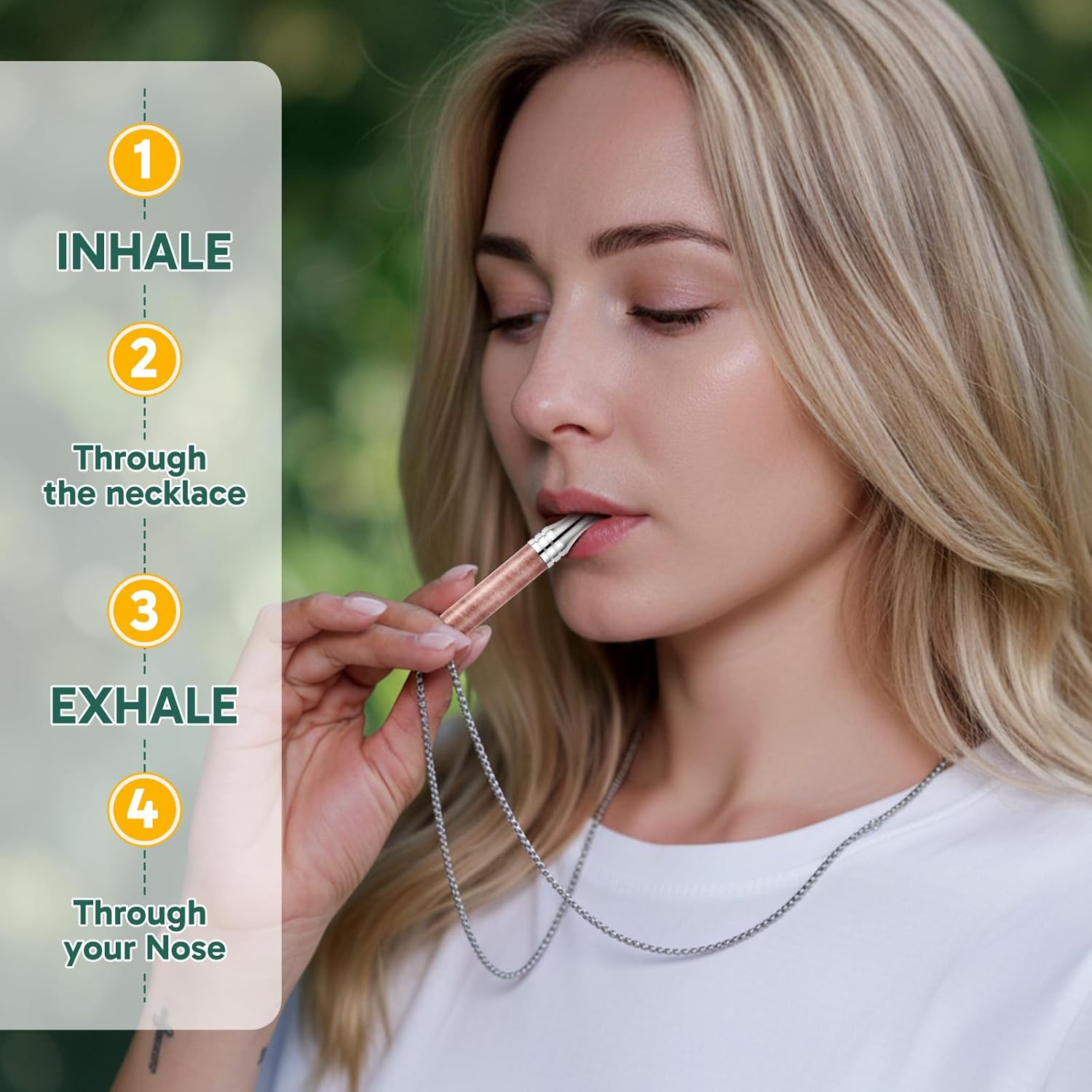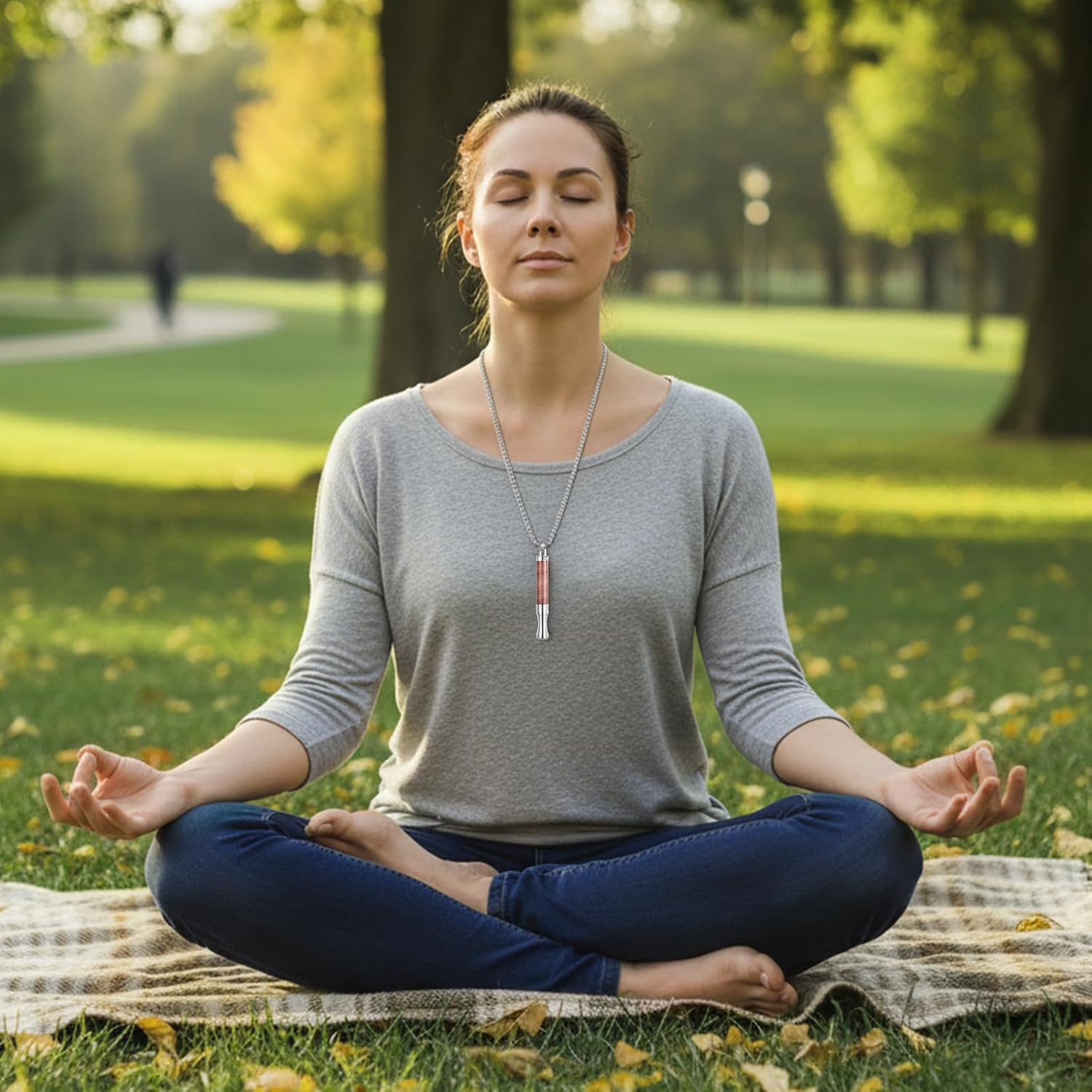 Find your breath anywhere. This breathing necklace guides slow, extended exhales to calm your nervous system, sharpen focus, and ease you into sleep—without electronics. Use it when work gets intense, before exams or meetings, during flights or commutes, at craving peaks, or as part of your nightly wind‑down.