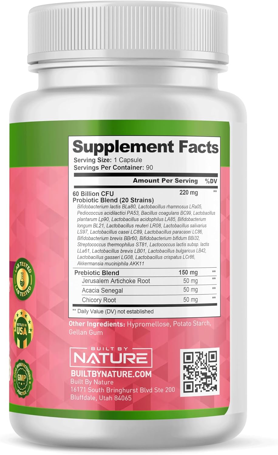 Built By Nature Probiotic for Women features 60 Billion CFUs from 20 diverse probiotic strains plus prebiotics to help balance your digestive tract, strengthen immune support, and support overall vaginal wellness. Formulated in delayed release capsules to maximize effectiveness, this shelf-stable and non-GMO supplement is ideal for both women seeking an effective probiotic.