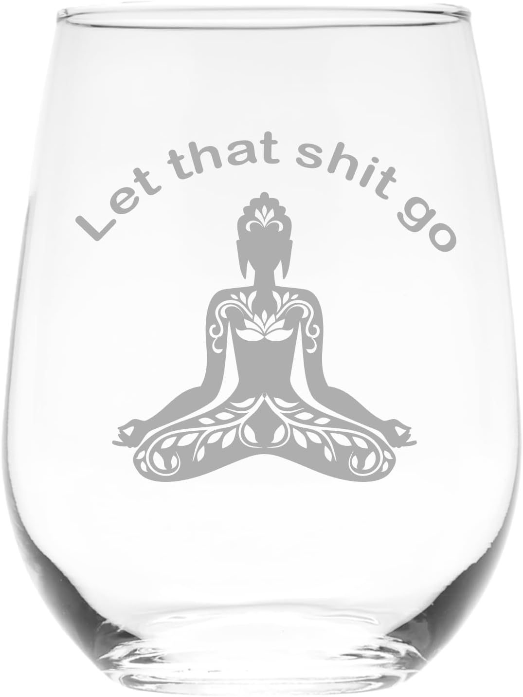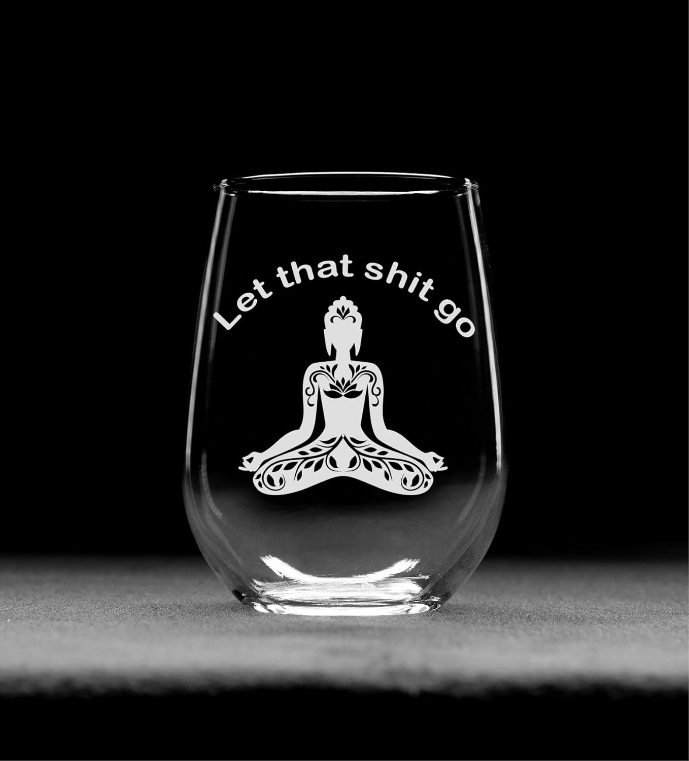 MEDITATION THEMED DESIGN: Buddha engraved stemless wine glass with the saying ‘let the sht go’ combines meditation, yoga and spirituality themes. The laser engraved buddha design serves both as drinkware and decorative piece