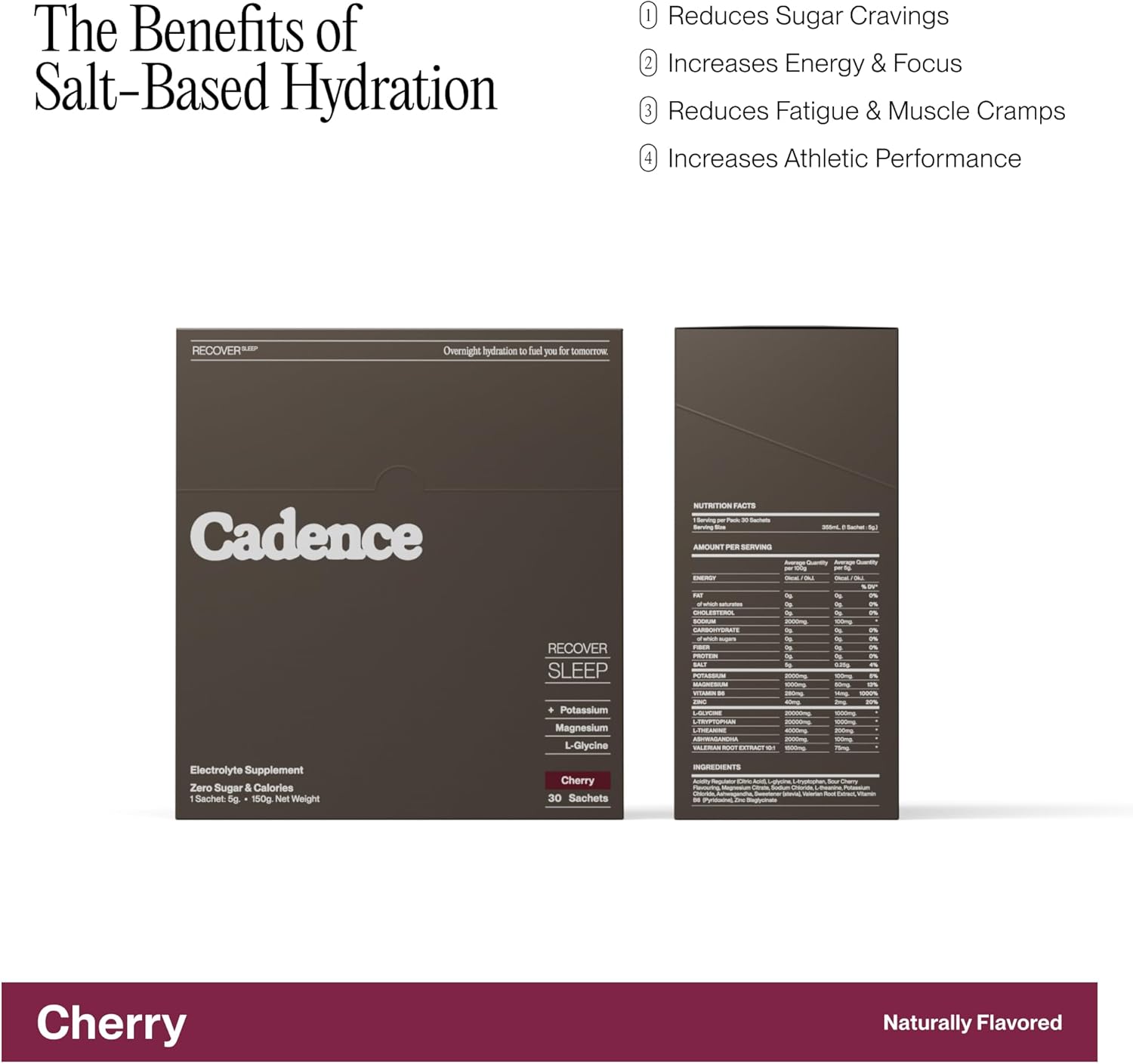 Advanced Sleep Support with Powerful Nootropic Complex: Cadence Recover Sleep Sachets in Cherry flavor combine L-Tryptophan, L-Glycine, L-Theanine, Ashwagandha, and Valerian Root Extract to help you fall asleep faster, improve sleep quality, and wake up refreshed. This potent blend supports melatonin and serotonin production, reduces stress, and promotes deep, restorative sleep for optimal overnight recovery.