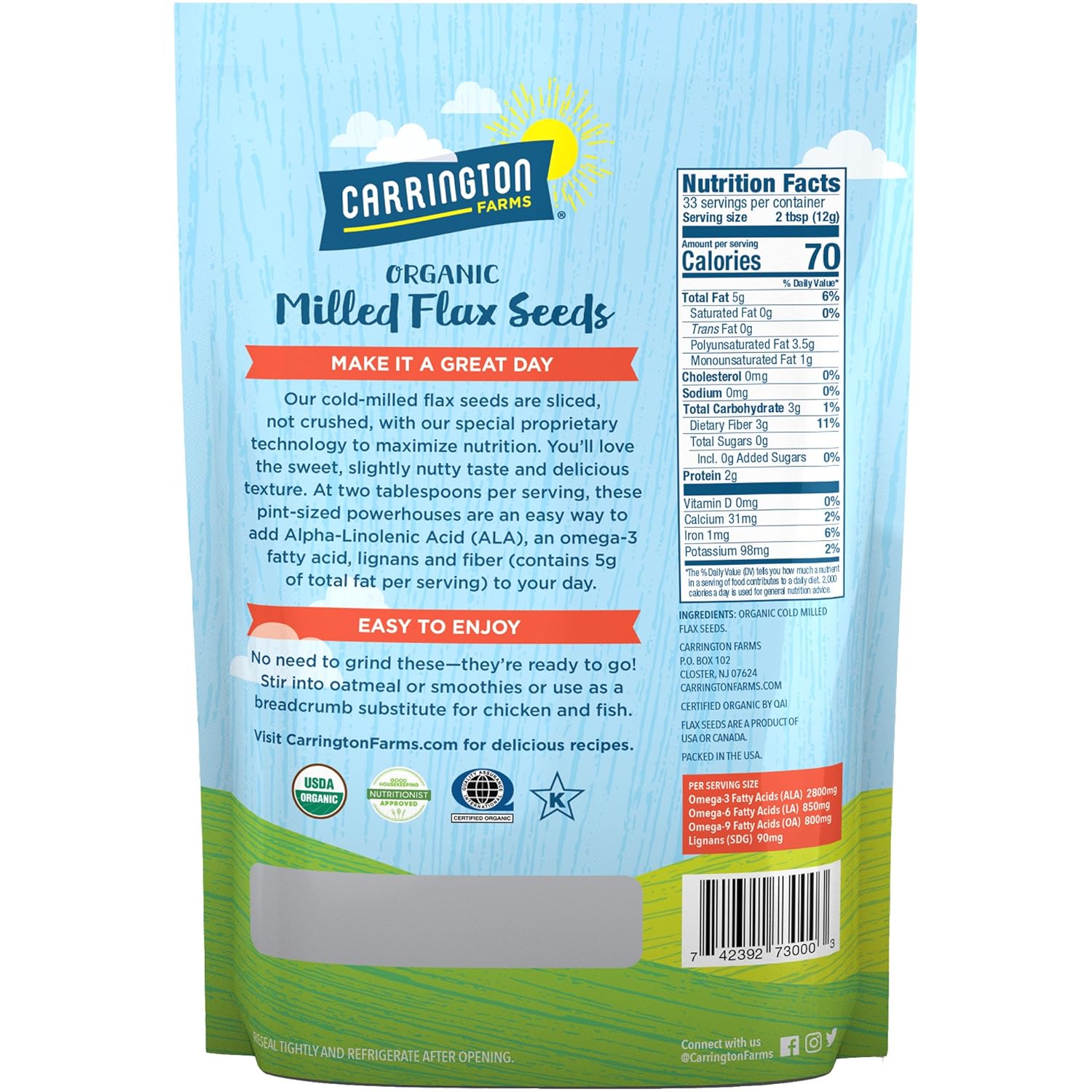 UNIQUE PROCESS – Carrington Farms unique proprietary Milling and Micro-Cleanse process assures only the finest Flax Seeds are thoroughly cleansed by natural means, and then surgically sliced, as opposed to pulverized, resulting in a delicious coarse flax seed grind that retains the maximum amount of healthy nutrients.