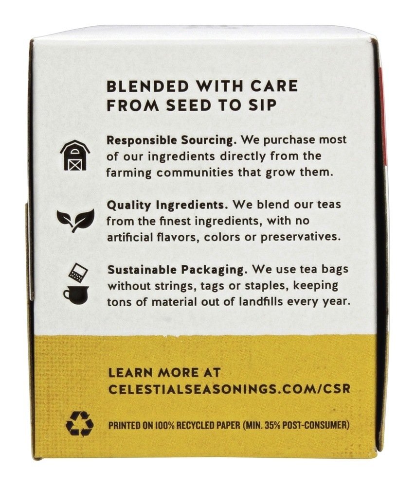 Celestial Seasonings Jammin’ Lemon Ginger Herbal Tea is the perfect way to unwind and relax after a long day. Our caffeine and gluten-free tea is infused with ginger. We achieve this flavor profile without the use of any artificial flavors, colors or artificial preservatives. To reduce excess waste, our herbal tea bags are stringless and come packaged in recycled boxes. Simply steep a Jammin’ Lemon Ginger tea bag in hot water for 4-6 minutes for the perfect cup. Includes six 20-count boxes of Celestial Seasonings Jammin’ Lemon Ginger Herbal Tea. Celestial Seasonings teas are an invitation to bring the perfect balance to your day. From herbal teas to chai and matcha lattes and everything in between, there’s a Celestial blend that’s just right for any occasion. We blend our teas using the finest herbs, teas, spices and botanicals available, and we lovingly package them in engaging, thoughtful boxes that truly represent the goodness found inside.