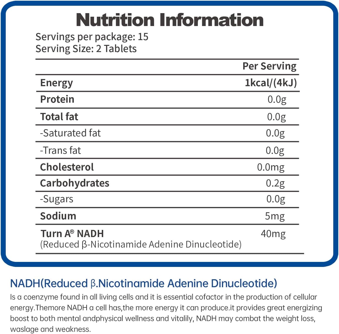 Safety Information Do not exceed recommended dose. Pregnant or nursing mothers, children under 18 and individuals with known medical condition should consult a physician before using this or any dietary supplement. Keep out of reach of children. Do not use if safety seal is damaged or missing. Store in a cool, dry place. Ingredients NADH (Reduced Nicotinamide Adenine Dinucleotide) Directions Take 2-4 tablets once a day, on an empty stomach or 30 minutes before meals with water. Legal Disclaimer Statements regarding dietary supplements have not been evaluated by the FDA and are not intended to diagnose, treat, cure, or prevent any disease or health condition.