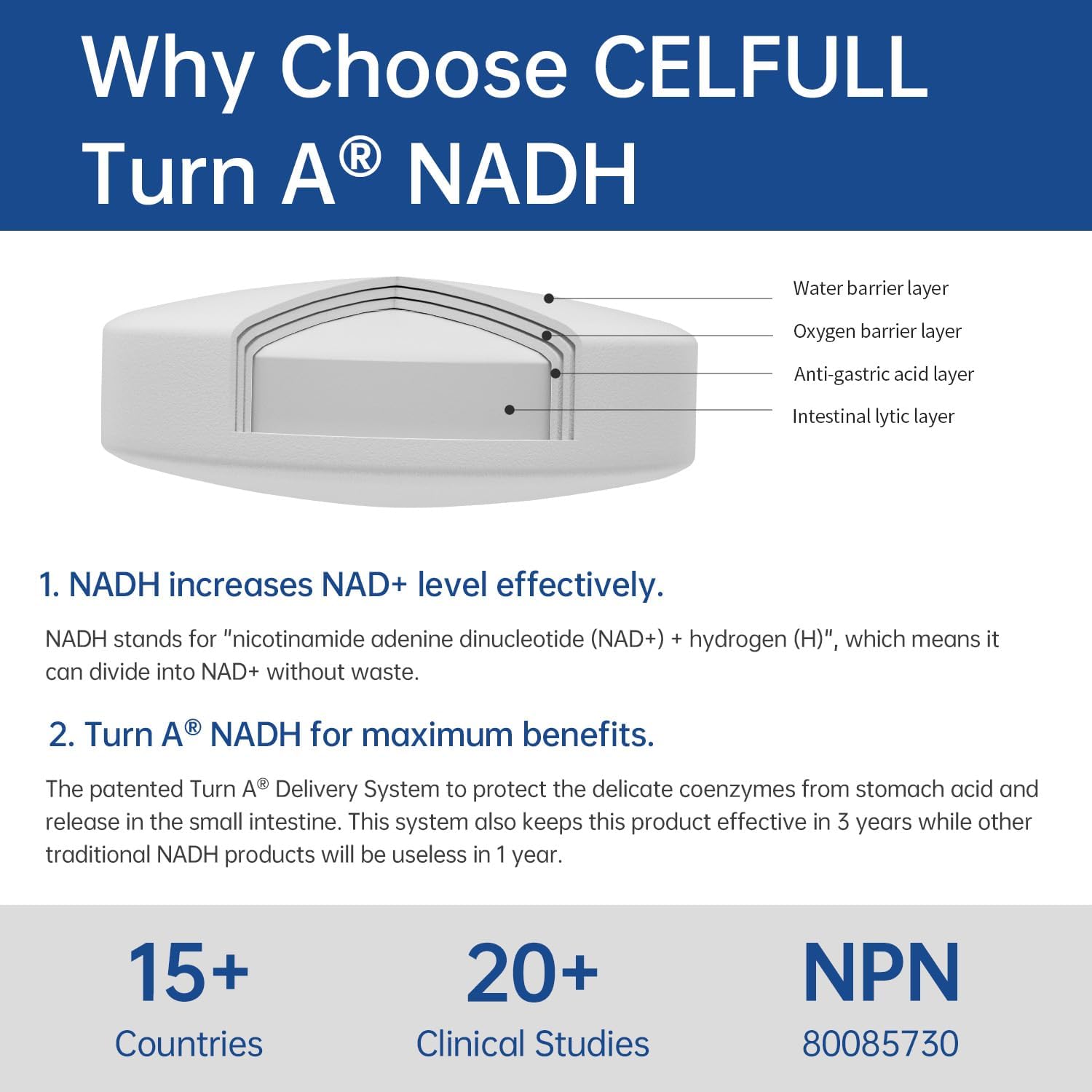 【One NADH is equivalent to four regular nad+ supplement】:CELFULL NADH is a faster, more thorough absorption, and more stable form of NAD. One piece of NADH product is equivalent to four regular pieces of NAD+,Replenish energy,Anti-aging.Using patented four-layer coating technology to achieve maximum absorption