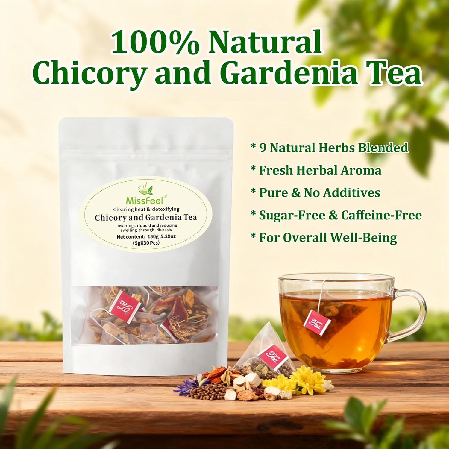 Mild & Pleasant Taste – Experience the beauty of visible, fresh ingredients in every cup. Carefully blended and 100% natural, free from sugar, caffeine, and artificial additives, our chicory and gardenia tea delivers rich aromas, mild taste, and a refreshing sip for your daily wellness