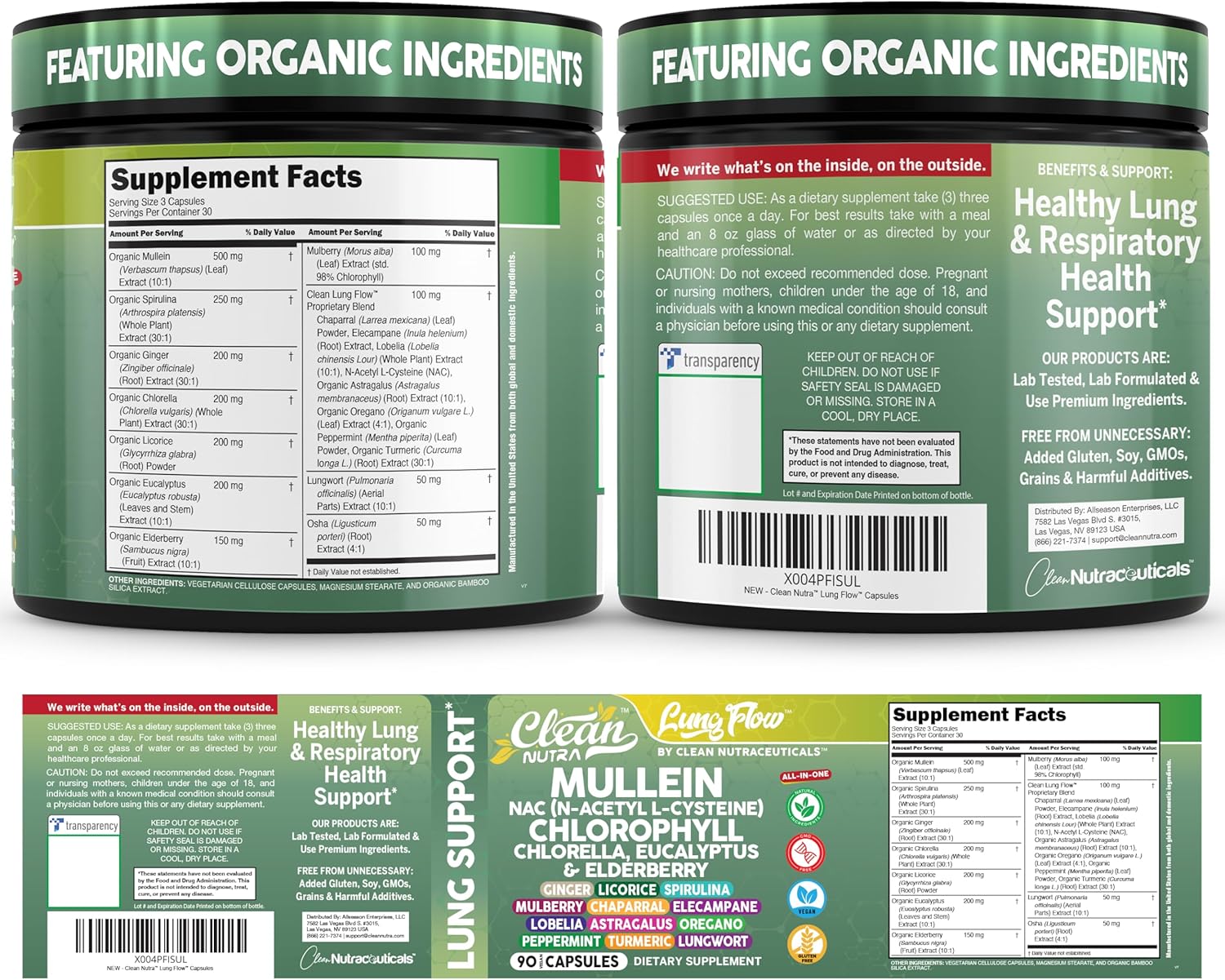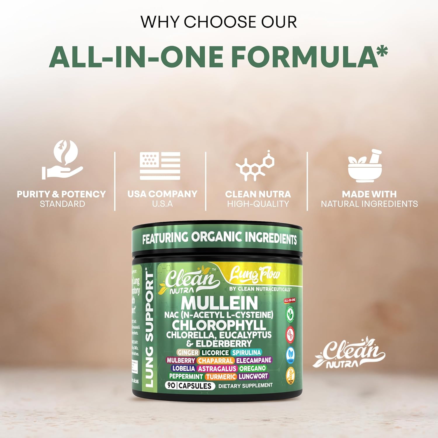 Vetted and trusted mullein leaf extract for lungs formula – Clean Nutraceuticals sources non-GMO herbs under strict standards to ensure purity, potency, and traceability for respiratory lung health, digestive health harmony, and long-term immune support. Lab testing confirms every batch is free from gluten, dairy, and common allergens, while our vegetable capsules provide clean delivery with zero artificial fillers. Choose quality, transparency, and proven herbs you can feel confident about.