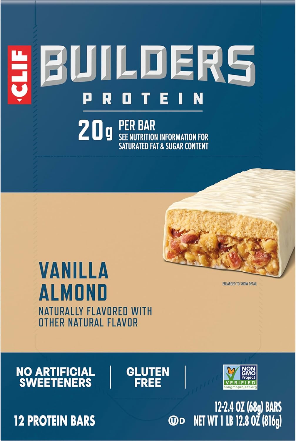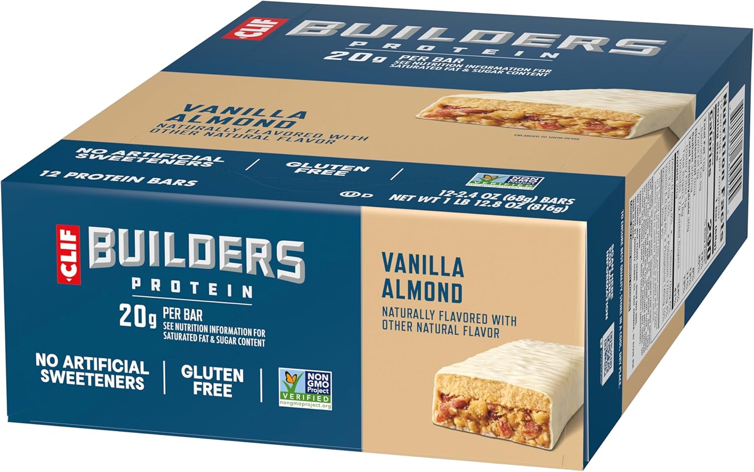 CLIF BUILDERS Vanilla Almond Flavor Protein Bars are designed to help sustain hardworking bodies after tough workouts, whether at the gym, on the court, or on the track. High protein bars packed with 20 grams of plant based protein per bar* to help support, rebuild, and repair muscles, these gluten free protein bars work as hard as you do to help build something great. These CLIF BUILDERS bars with a delicious vanilla almond flavor help fuel recovery and get you ready for your next tough workout. Non-GMO Project Verified and low glycemic**, they contain no high-fructose corn syrup and no artificial sweeteners, making CLIF BUILDERS protein bars a powerful (and tasty) addition to your post-workout recovery regimen. *See nutrition information for saturated fat and sugar content. **Low-glycemic index foods digest slowly for prolonged levels of energy.