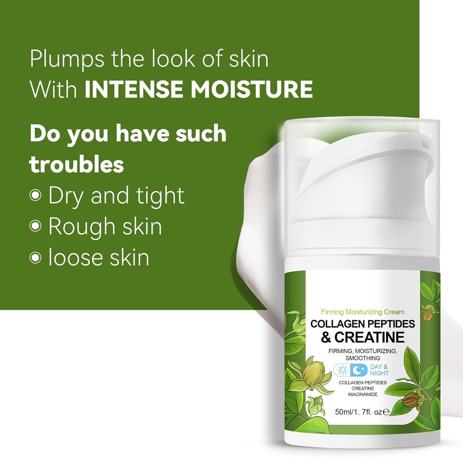 Transform your skincare routine with this advanced Collagen Peptide Complex Moisture Cream. Formulated with powerful ingredients including retinol, creatine, and plant squalane, this comprehensive facial cream works to visibly tighten and firm your skin while targeting signs of aging. The rich, moisturizing formula is designed for both day and night use, helping to diminish the appearance of fine lines and wrinkles while providing deep hydration. The 1.7oz jar delivers a luxurious cream that absorbs easily into the skin, supporting its natural renewal process. This multi-tasking moisturizer combines the benefits of several active ingredients to help restore your skin’s youthful appearance and maintain optimal hydration levels. Perfect for those seeking an effective anti-aging solution, this cream helps create a smoother, more radiant complexion while supporting skin’s natural firmness.