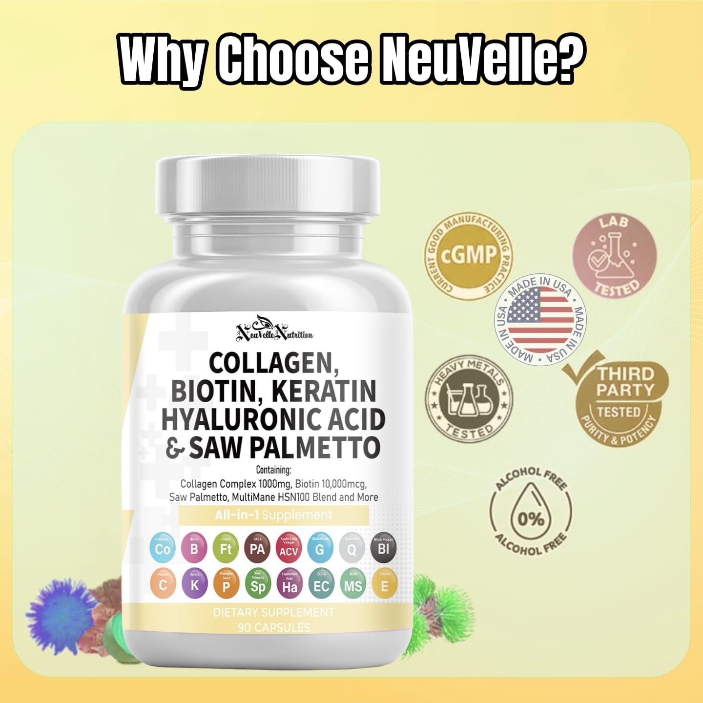 USA PREMIUM QUALITY & TRUSTED USA-MADE FORMULA – PURE, SAFE & EFFECTIVE Manufactured in a GMP-certified, FDA-registered facility in the USA, every NeuVelle capsule is Non-GMO, Gluten-Free, and third-party tested for purity, potency, and consistency. Our collagen-biotin complex offers a clean, science-backed alternative to generic collagen tablets or keratin-only treatments. Free from artificial binders and unnecessary fillers, this formula ensures maximum absorption and real, visible results. Elevate your routine with a trusted brand that merges luxury-grade ingredients and proven performance.