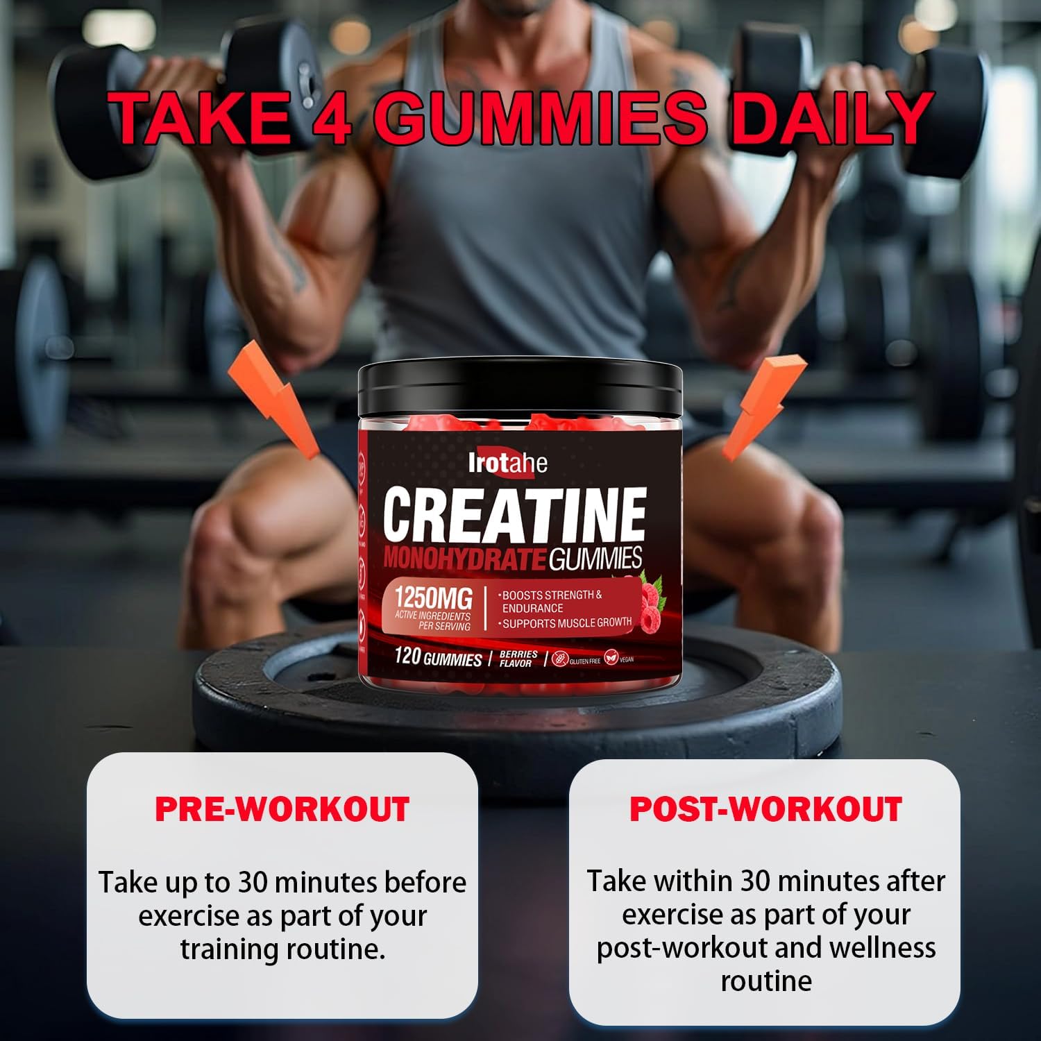 HIGH POTENCY CREATINE SUPPLEMENT: Features 1250mg of pure Micronized Creatine Monohydrate per serving (4 gummies), the most researched and effective form of creatine for supporting muscle growth and athletic performance